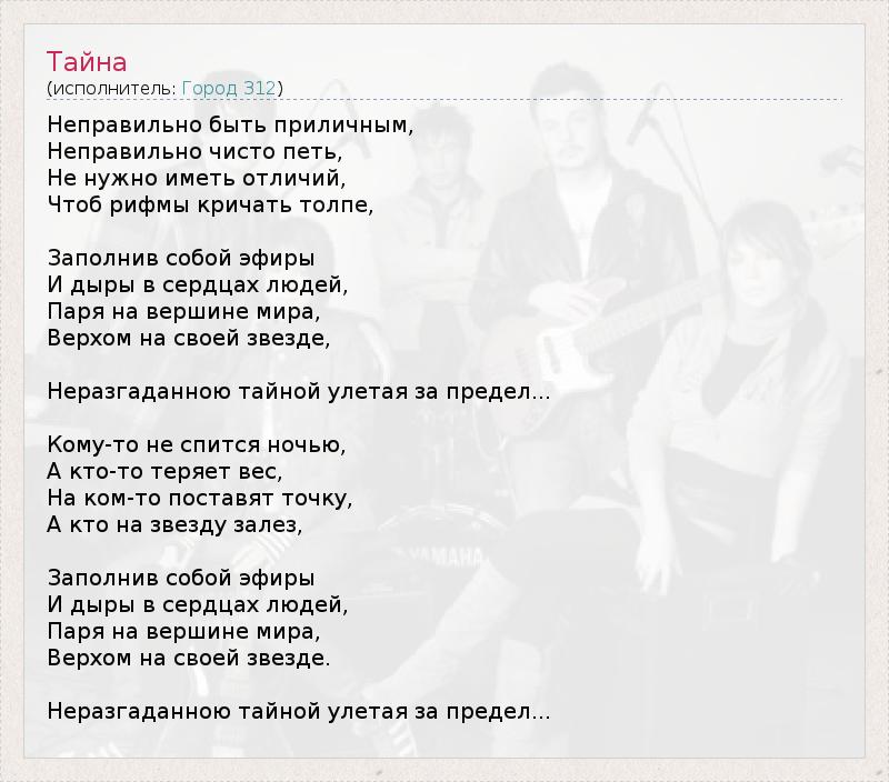 Это интересно:«Город 312» (часто: «Город», «Горожане») - группа из города Бишкек (Киргизия), играющая поп-рок.Состав группы:Ая - вокал (консерватория по классу эстрадного вокала) Маша - гитара (частная школа игры на гитаре) Дим - клавишные (бэк-вокал; отделение хорового дирижирования) Леон - бас, бэк-вокал (эстрадное отделение музыкального училища по классу бас-гитары) До июля 2009 года барабанщиком... продолжение