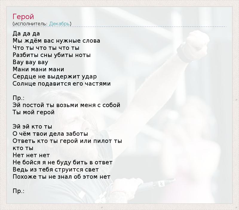 Да да да Мы ждём вас нужные слова Что ты что ты что ты Разбиты сны убиты ноты Вау вау вау Мани мани мани Сердце не выдержит удар Солнце подавится его частями Пр.: Эй постой ты возьми меня с собой Ты мой герой Эй эй кто ты О чём твои дела заботы Ответь кто ты герой или пилот ты кто ты Нет нет нет Не бойся я не буду бить в ответ Ведь из тебя струится свет Похоже ты не знал об этом нет Пр.: