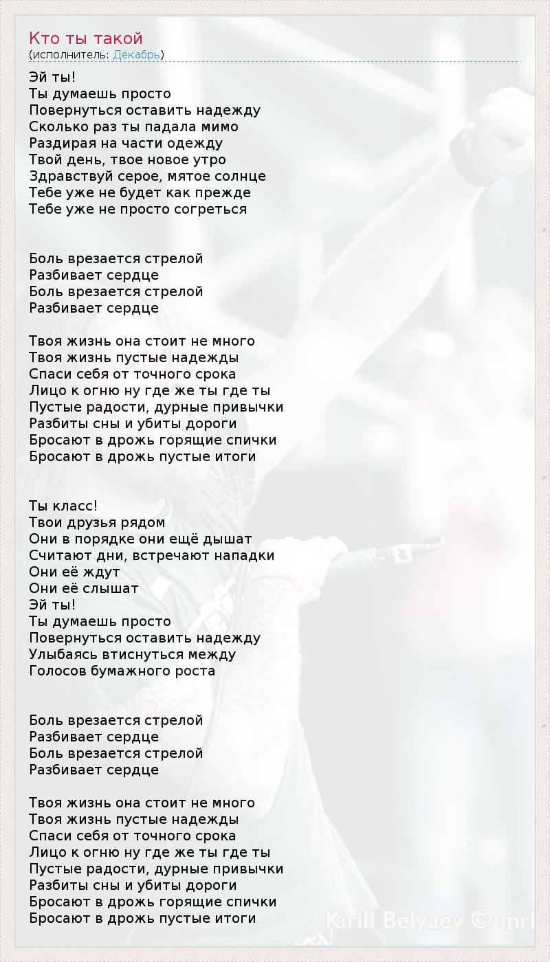 Эй ты! Ты думаешь просто Повернуться оставить надежду Сколько раз ты падала мимо Раздирая на части одежду Твой день, твое новое утро Здравствуй серое, мятое солнце Тебе уже не будет как прежде Тебе уже не просто согреться Боль врезается стрелой Разбивает сердце Боль врезается стрелой Разбивает сердце Твоя жизнь она стоит не много Твоя жизнь пустые надежды Спаси себя от точного срока Лицо к огню ну где же ты где ты Пустые радости, дурные привычки Разбиты сны и убиты дороги Бросают в дрожь горящие спички Бросают в дрожь пустые итоги Ты класс! Твои друзья рядом Они в порядке они ещё дышат Считают дни, встречают нападки Они её ждут Они её слышат Эй ты! Ты думаешь просто Повернуться оставить надежду Улыбаясь втиснуться между Голосов бумажного роста Боль врезается стрелой Разбивает сердце Боль врезается стрелой Разбивает сердце Твоя жизнь она стоит не много Твоя жизнь пустые надежды Спаси себя от точного срока Лицо к огню ну где же ты где ты Пустые радости, дурные привычки Разбиты сны и убиты дороги Бросают в дрожь горящие спички Бросают в дрожь пустые итоги