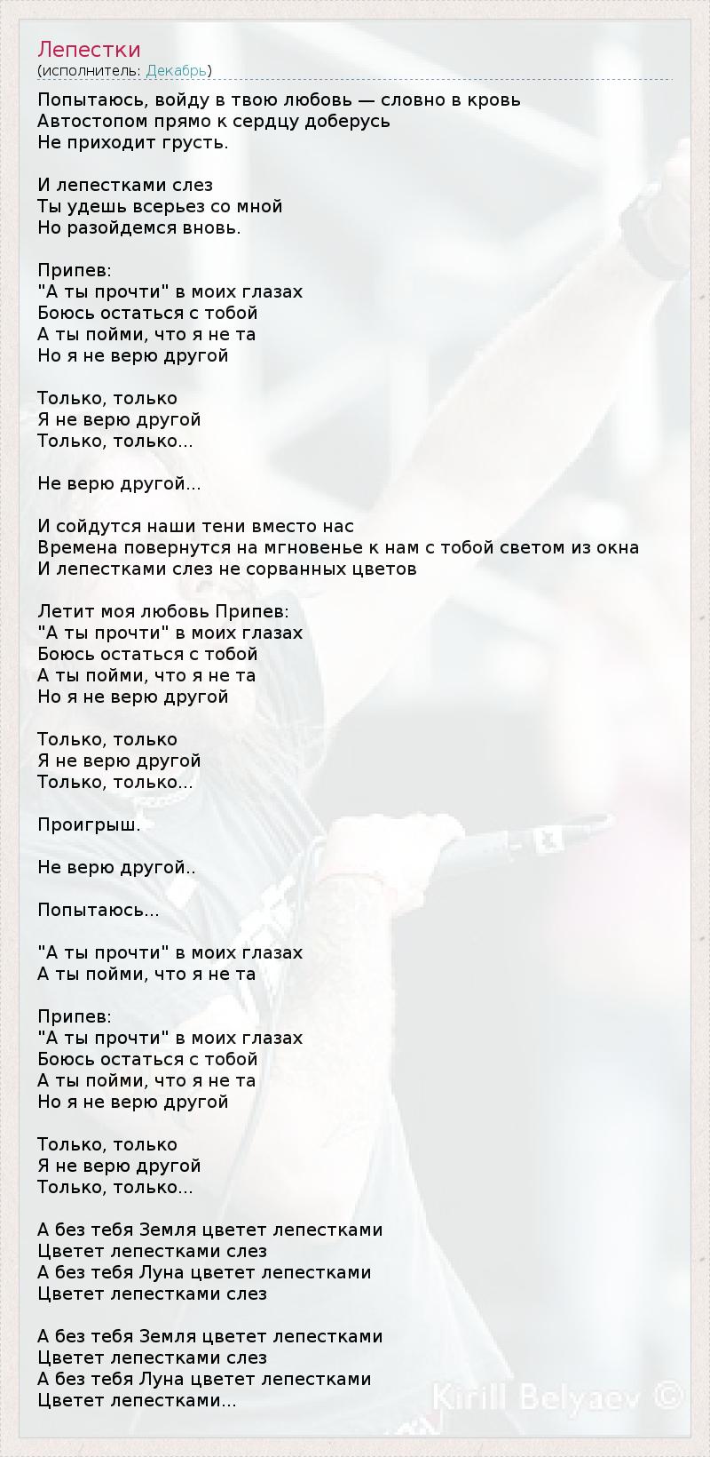 Попытаюсь, войду в твою любовь — словно в кровь Автостопом прямо к сердцу доберусь Не приходит грусть. И лепестками слез Ты удешь всерьез со мной Но разойдемся вновь. Припев: "А ты прочти" в моих глазах Боюсь остаться с тобой А ты пойми, что я не та Но я не верю другой Только, только Я не верю другой Только, только... Не верю другой... И сойдутся наши тени вместо нас Времена повернутся на мгновенье к нам с тобой светом из окна И лепестками слез не сорванных цветов Летит моя любовь Припев: "А ты прочти" в моих глазах Боюсь остаться с тобой А ты пойми, что я не та Но я не верю другой Только, только Я не верю другой Только, только... Проигрыш. Не верю другой.. Попытаюсь... "А ты прочти" в моих глазах А ты пойми, что я не та Припев: "А ты прочти" в моих глазах Боюсь остаться с тобой А ты пойми, что я не та Но я не верю другой Только, только Я не верю другой Только, только... А без тебя Земля цветет лепестками Цветет лепестками слез А без тебя Луна цветет лепестками Цветет лепестками слез А без тебя Земля цветет лепестками Цветет лепестками слез А без тебя Луна цветет лепестками Цветет лепестками...