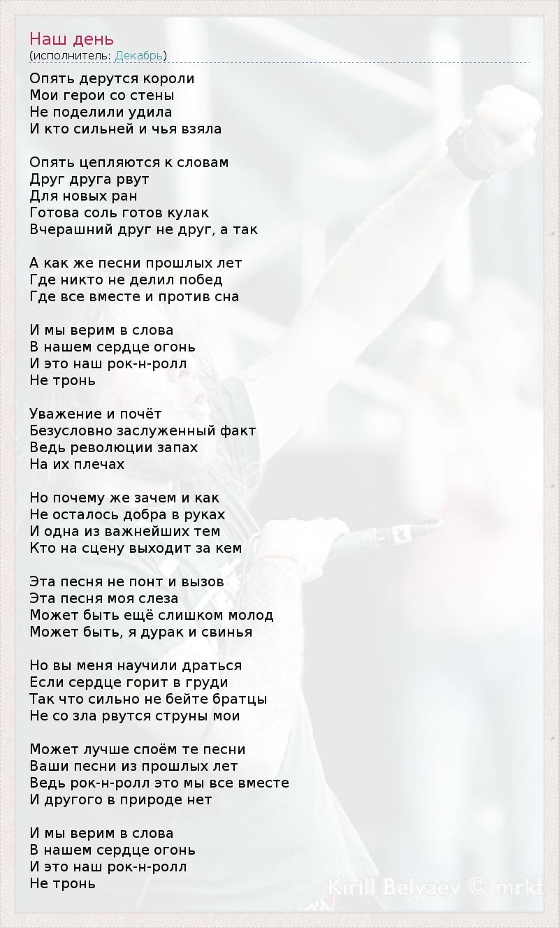 Опять дерутся короли Мои герои со стены Не поделили удила И кто сильней и чья взяла Опять цепляются к словам Друг друга рвут Для новых ран Готова соль готов кулак Вчерашний друг не друг, а так А как же песни прошлых лет Где никто не делил побед Где все вместе и против сна И мы верим в слова В нашем сердце огонь И это наш рок-н-ролл Не тронь Уважение и почёт Безусловно заслуженный факт Ведь революции запах На их плечах Но почему же зачем и как Не осталось добра в руках И одна из важнейших тем Кто на сцену выходит за кем Эта песня не понт и вызов Эта песня моя слеза Может быть ещё слишком молод Может быть, я дурак и свинья Но вы меня научили драться Если сердце горит в груди Так что сильно не бейте братцы Не со зла рвутся струны мои Может лучше споём те песни Ваши песни из прошлых лет Ведь рок-н-ролл это мы все вместе И другого в природе нет И мы верим в слова В нашем сердце огонь И это наш рок-н-ролл Не тронь