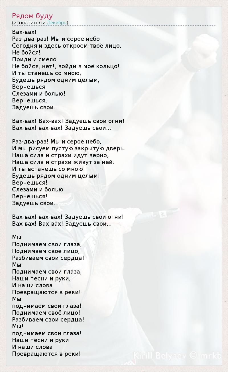 Вах-вах! Раз-два-раз! Мы и серое небо Сегодня и здесь откроем твоё лицо. Не бойся! Приди и смело Не бойся, нет!, войди в моё кольцо! И ты станешь со мною, Будешь рядом одним целым, Вернёшься Слезами и болью! Вернёшься, Задуешь свои... Вах-вах! Вах-вах! Задуешь свои огни! Вах-вах! вах-вах! Задуешь свои... Раз-два-раз! Мы и серое небо, И мы рисуем пустую закрытую дверь. Наша сила и страхи идут верно, Наша сила и страхи живут за ней. И ты встанешь со мною! Будешь рядом одним целым! Вернёшься! Слезами и болью Вернёшься! Задуешь свои... Вах-вах! вах-вах! Задуешь свои огни! Вах-вах! Вах-вах! Задуешь свои... Мы Поднимаем свои глаза, Поднимаем своё лицо, Разбиваем свои сердца! Мы Поднимаем свои глаза, Наши песни и руки, И наши слова Превращаются в реки! Мы поднимаем свои глаза! Поднимаем своё лицо! Разбиваем свои сердца! Мы! поднимаем свои глаза! Наши песни и руки И наши слова Превращаются в реки!