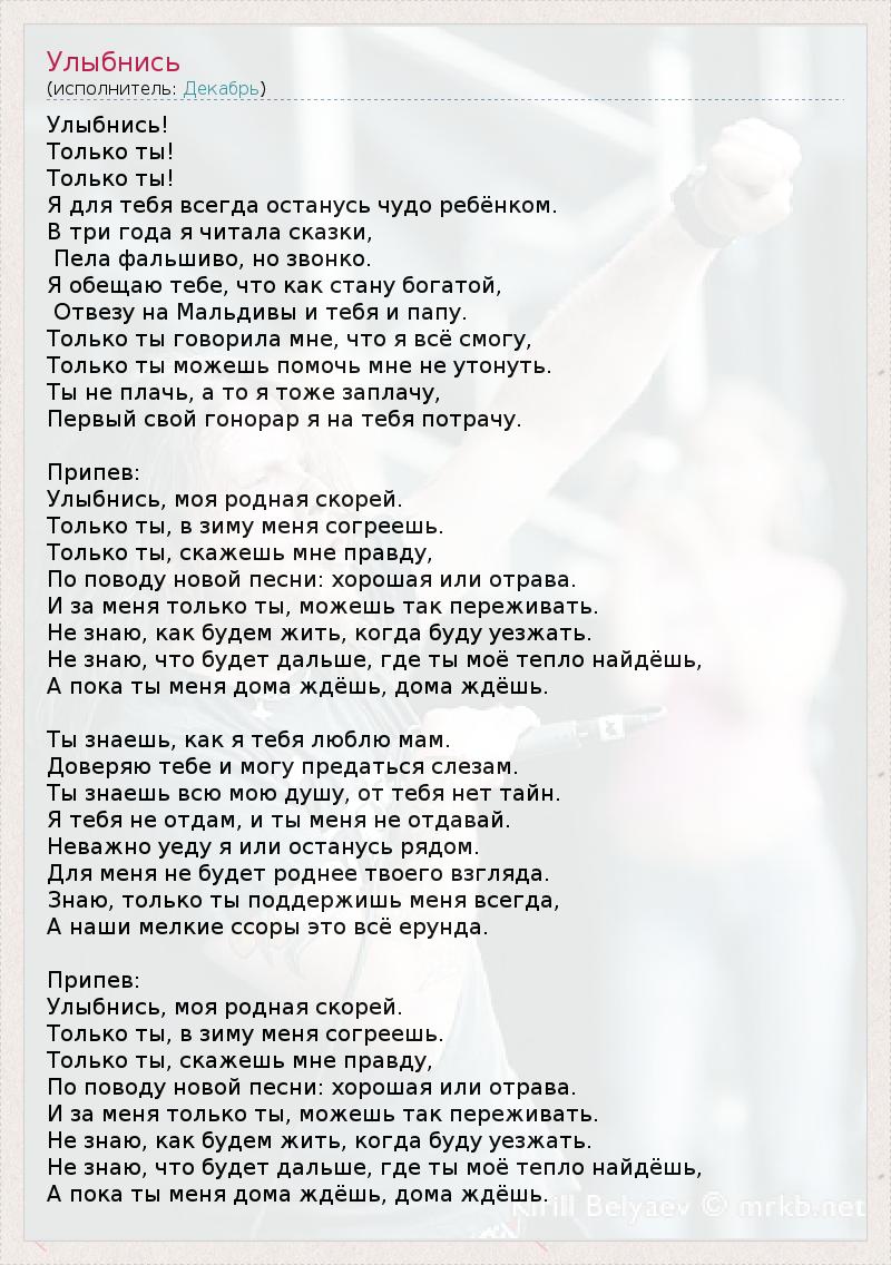 Улыбнись! Только ты! Только ты! Я для тебя всегда останусь чудо ребёнком. В три года я читала сказки, Пела фальшиво, но звонко. Я обещаю тебе, что как стану богатой, Отвезу на Мальдивы и тебя и папу. Только ты говорила мне, что я всё смогу, Только ты можешь помочь мне не утонуть. Ты не плачь, а то я тоже заплачу, Первый свой гонорар я на тебя потрачу. Припев: Улыбнись, моя родная скорей. Только ты, в зиму меня согреешь. Только ты, скажешь мне правду, По поводу новой песни: хорошая или отрава. И за меня только ты, можешь так переживать. Не знаю, как будем жить, когда буду уезжать. Не знаю, что будет дальше, где ты моё тепло найдёшь, А пока ты меня дома ждёшь, дома ждёшь. Ты знаешь, как я тебя люблю мам. Доверяю тебе и могу предаться слезам. Ты знаешь всю мою душу, от тебя нет тайн. Я тебя не отдам, и ты меня не отдавай. Неважно уеду я или останусь рядом. Для меня не будет роднее твоего взгляда. Знаю, только ты поддержишь меня всегда, А наши мелкие ссоры это всё ерунда. Припев: Улыбнись, моя родная скорей. Только ты, в зиму меня согреешь. Только ты, скажешь мне правду, По поводу новой песни: хорошая или отрава. И за меня только ты, можешь так переживать. Не знаю, как будем жить, когда буду уезжать. Не знаю, что будет дальше, где ты моё тепло найдёшь, А пока ты меня дома ждёшь, дома ждёшь.