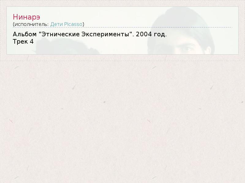 Это интересно:Группа Дети Picasso - вероятно, самая благородная группа российской клубной сцены, пишут самые авторитетные печатные издания. Они выпустили 3 абсолютно разных альбома: в стиле рокопопс (Месяц улыбок), в стиле этно-гранж (Этнические эксперименты) и лучший, по признанию многих критиков, русскоязычный рок-альбом 2006 года (Глубина). Дети Picasso успели выступить с Depeche Mode и Massive Attack в Олимпийском. В 2002... продолжение