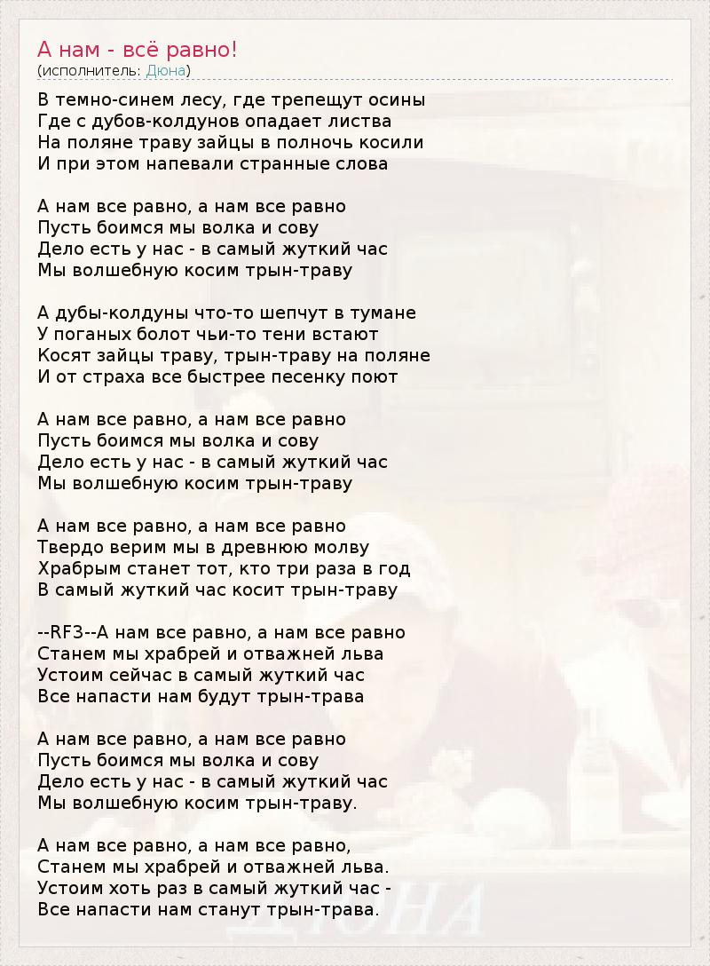 В темно-синем лесу, где трепещут осины Где с дубов-колдунов опадает листва На поляне траву зайцы в полночь косили И при этом напевали странные слова А нам все равно, а нам все равно Пусть боимся мы волка и сову Дело есть у нас - в самый жуткий час Мы волшебную косим трын-траву А дубы-колдуны что-то шепчут в тумане У поганых болот чьи-то тени встают Косят зайцы траву, трын-траву на поляне И от страха все быстрее песенку поют А нам все равно, а нам все равно Пусть боимся мы волка и сову Дело есть у нас - в самый жуткий час Мы волшебную косим трын-траву А нам все равно, а нам все равно Твердо верим мы в древнюю молву Храбрым станет тот, кто три раза в год В самый жуткий час косит трын-траву --RF3--А нам все равно, а нам все равно Станем мы храбрей и отважней льва Устоим сейчас в самый жуткий час Все напасти нам будут трын-трава А нам все равно, а нам все равно Пусть боимся мы волка и сову Дело есть у нас - в самый жуткий час Мы волшебную косим трын-траву. А нам все равно, а нам все равно, Станем мы храбрей и отважней льва. Устоим хоть раз в самый жуткий час - Все напасти нам станут трын-трава.