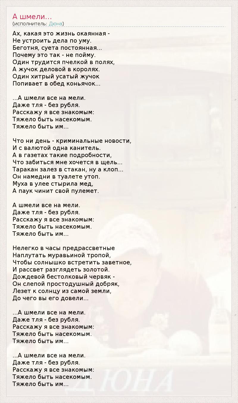 Ах, какая это жизнь окаянная - Не устроить дела по уму. Беготня, суета постоянная... Почему это так - не пойму. Один трудится пчелкой в полях, А жучок деловой в королях. Один хитрый усатый жучок Попивает в обед коньячок... ...А шмели все на мели. Даже тля - без рубля. Расскажу я все знакомым: Тяжело быть насекомым. Тяжело быть им... Что ни день - криминальные новости, И с валютой одна канитель. А в газетах такие подробности, Что забиться мне хочется в щель... Таракан залез в стакан, ну а клоп... Он намедни в туалете утоп. Муха в улее стырила мед, А паук чинит свой пулемет. А шмели все на мели. Даже тля - без рубля. Расскажу я все знакомым: Тяжело быть насекомым. Тяжело быть им... Нелегко в часы предрассветные Наплутать муравьиной тропой, Чтобы солнышко встретить заветное, И рассвет разглядеть золотой. Дождевой бестолковый червяк - Он слепой простодушный добряк, Лезет к солнцу из самой земли, До чего вы его довели... ...А шмели все на мели. Даже тля - без рубля. Расскажу я все знакомым: Тяжело быть насекомым. Тяжело быть им... ...А шмели все на мели. Даже тля - без рубля. Расскажу я все знакомым: Тяжело быть насекомым. Тяжело быть им...
