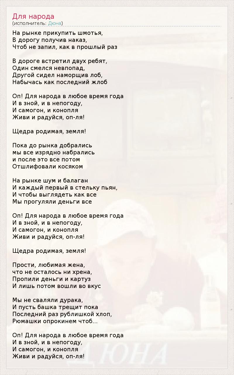 На рынке прикупить шмотья, В дорогу получив наказ, Чтоб не запил, как в прошлый раз В дороге встретил двух ребят, Один смелся невпопад, Другой сидел наморщив лоб, Набычась как последний жлоб Оп! Для народа в любое время года И в зной, и в непогоду, И самогон, и конопля Живи и радуйся, оп-ля! Щедра родимая, земля! Пока до рынка добрались мы все изрядно набрались и после это все потом Отшлифовали косяком На рынке шум и балаган И каждый первый в стельку пьян, И чтобы выглядеть как все Мы прогуляли деньги все Оп! Для народа в любое время года И в зной, и в непогоду, И самогон, и конопля Живи и радуйся, оп-ля! Щедра родимая, земля! Прости, любимая жена, что не осталось ни хрена, Пропили деньги и картуз И лишь потом вошли во вкус Мы не сваляли дурака, И пусть башка трещит пока Последний раз рублишкой хлоп, Рюмашки опрокинем чтоб... Оп! Для народа в любое время года И в зной, и в непогоду, И самогон, и конопля Живи и радуйся, оп-ля!