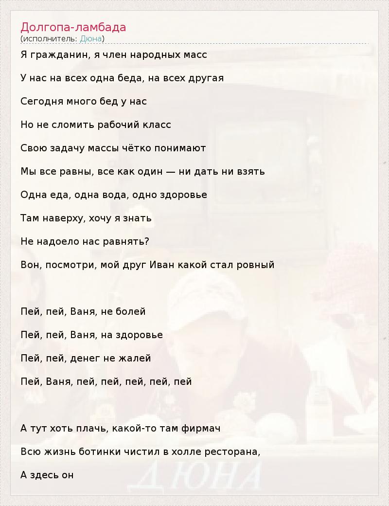 Я гражданин, я член народных масс У нас на всех одна беда, на всех другая Сегодня много бед у нас Но не сломить рабочий класс Свою задачу массы чётко понимают Мы все равны, все как один — ни дать ни взять Одна еда, одна вода, одно здоровье Там наверху, хочу я знать Не надоело нас равнять? Вон, посмотри, мой друг Иван какой стал ровный Пей, пей, Ваня, не болей Пей, пей, Ваня, на здоровье Пей, пей, денег не жалей Пей, Ваня, пей, пей, пей, пей, пей А тут хоть плачь, какой-то там фирмач Всю жизнь ботинки чистил в холле ресторана, А здесь он