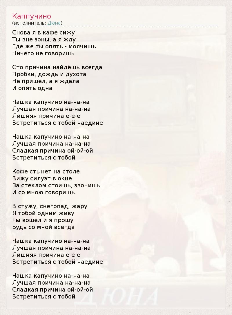 Снова я в кафе сижу Ты вне зоны, а я жду Где же ты опять - молчишь Ничего не говоришь Сто причина найдёшь всегда Пробки, дождь и духота Не пришёл, а я ждала И опять одна Чашка капучино на-на-на Лучшая причина на-на-на Лишняя причина е-е-е Встретиться с тобой наедине Чашка капучино на-на-на Лучшая причина на-на-на Сладкая причина ой-ой-ой Встретиться с тобой Кофе стынет на столе Вижу силуэт в окне За стеклом стоишь, звонишь И со мною говоришь В стужу, снегопад, жару Я тобой одним живу Ты вошёл и я прошу Будь со мной всегда Чашка капучино на-на-на Лучшая причина на-на-на Лишняя причина е-е-е Встретиться с тобой наедине Чашка капучино на-на-на Лучшая причина на-на-на Сладкая причина ой-ой-ой Встретиться с тобой