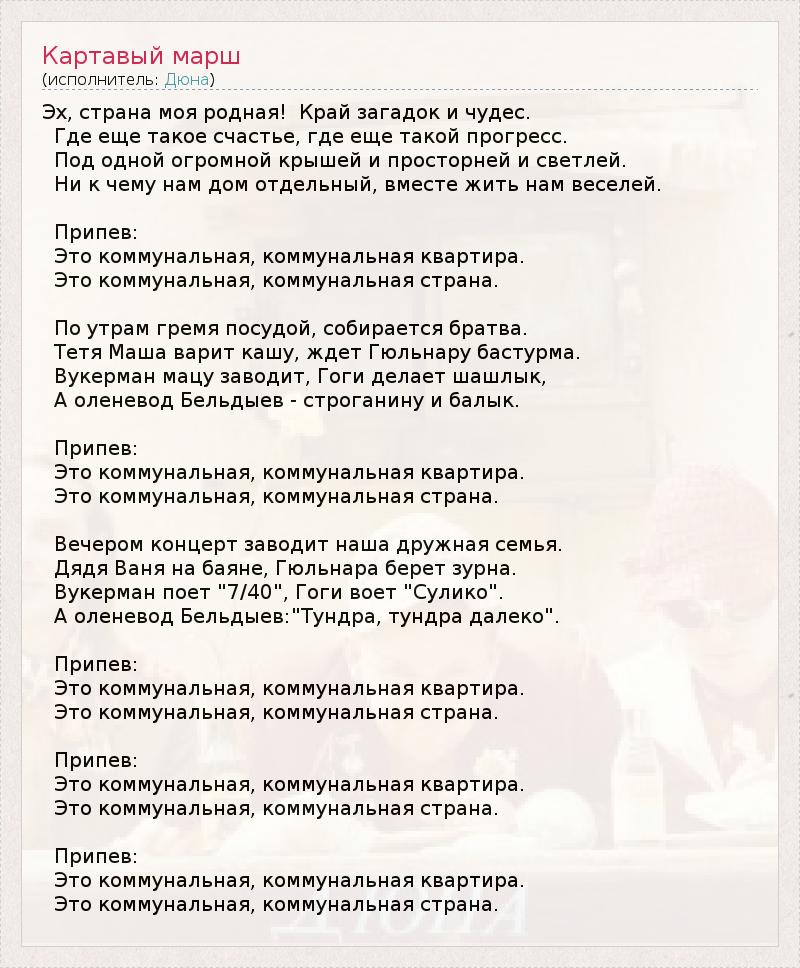 Эх, страна моя родная! Край загадок и чудес. Где еще такое счастье, где еще такой прогресс. Под одной огромной крышей и просторней и светлей. Ни к чему нам дом отдельный, вместе жить нам веселей. Припев: Это коммунальная, коммунальная квартира. Это коммунальная, коммунальная страна. По утрам гремя посудой, собирается братва. Тетя Маша варит кашу, ждет Гюльнару бастурма. Вукерман мацу заводит, Гоги делает шашлык, А оленевод Бельдыев - строганину и балык. Припев: Это коммунальная, коммунальная квартира. Это коммунальная, коммунальная страна. Вечером концерт заводит наша дружная семья. Дядя Ваня на баяне, Гюльнара берет зурна. Вукерман поет "7/40", Гоги воет "Сулико". А оленевод Бельдыев:"Тундра, тундра далеко". Припев: Это коммунальная, коммунальная квартира. Это коммунальная, коммунальная страна. Припев: Это коммунальная, коммунальная квартира. Это коммунальная, коммунальная страна. Припев: Это коммунальная, коммунальная квартира. Это коммунальная, коммунальная страна.