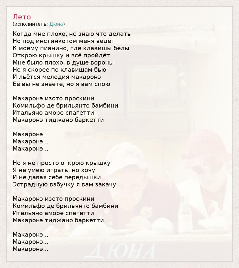Когда мне плохо, не знаю что делать Но под инстинкотом меня ведёт К моему пианино, где клавишы белы Открою крышку и всё пройдёт Мне было плохо, в душе вороны Но я скорее по клавишам бью И льётся мелодия макаронэ Её вы не знаете, но я вам спою Макаронэ изото проскини Комильфо де брильянто бамбини Итальяно аморе спагетти Макаронэ тиджано баркетти Макаронэ... Макаронэ... Макаронэ... Но я не просто открою крышку Я не умею играть, но хочу И не давая себе передышки Эстрадную взбучку я вам закачу Макаронэ изото проскини Комильфо де брильянто бамбини Итальяно аморе спагетти Макаронэ тиджано баркетти Макаронэ... Макаронэ... Макаронэ...