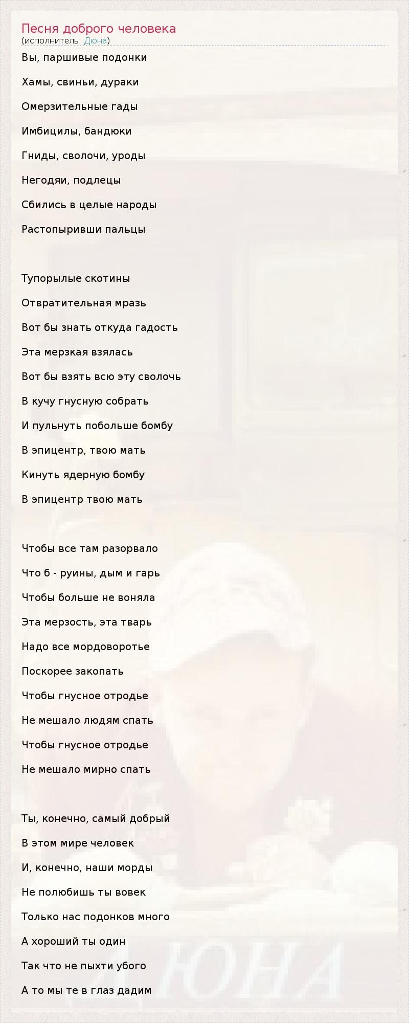Вы, паршивые подонки Хамы, свиньи, дураки Омерзительные гады Имбицилы, бандюки Гниды, сволочи, уроды Негодяи, подлецы Сбились в целые народы Растопыривши пальцы Тупорылые скотины Отвратительная мразь Вот бы знать откуда гадость Эта мерзкая взялась Вот бы взять всю эту сволочь В кучу гнусную собрать И пульнуть побольше бомбу В эпицентр, твою мать Кинуть ядерную бомбу В эпицентр твою мать Чтобы все там разорвало Что б - руины, дым и гарь Чтобы больше не воняла Эта мерзость, эта тварь Надо все мордоворотье Поскорее закопать Чтобы гнусное отродье Не мешало людям спать Чтобы гнусное отродье Не мешало мирно спать Ты, конечно, самый добрый В этом мире человек И, конечно, наши морды Не полюбишь ты вовек Только нас подонков много А хороший ты один Так что не пыхти убого А то мы те в глаз дадим