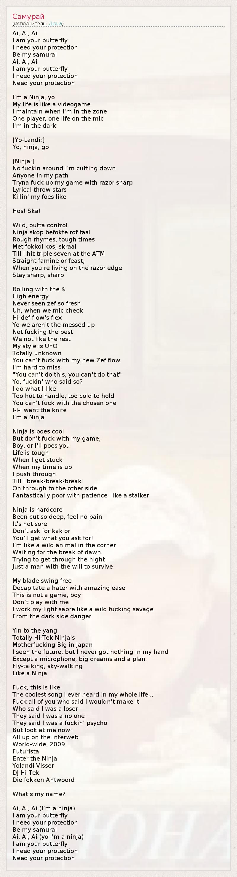 Ай, ай, ай Я твоя бабочка, Мне нужна твоя защита, Будь моим самураем, Ай, ай, ай Я твоя бабочка, Мне нужна твоя защита, Нужна твоя защита. 1 Я Нинзя, йоу, Моя жизнь похожа на видеоигру, В которую я режусь, заступая на территорию. Один игрок, одна жизнь, у микрофона я в Темноте. [Иоланди:] Йоу, давай Нинзя! [Нинзя:] Не вы*бывайся, я кромсаю всех, Кто стоит у меня на пути 2 Пытаешься потягаться с моей игрой, с Остроотточенными метательными ножами 3 слов? Разбираюсь с врагами в два счета Просто чума! Выхожу из себя, Нинзя накидывает жесткое словцо; Жесткие рифмы про жесткие времена, Без еды, кощи-мощи. 4 Пока я не выбил три семерки у однорукого бандита. 5 Сделай или сдохни, Если ты живешь на острее, Будь сам заточен! Мы разжились деньжонкой с SOS 6 Суперэнергия, Вы не видели прежде такого освежающего zef-а. Ух, мы у микрофона, зацени, Как качает Hi-Tek Йоу мы не г*вно, Но мы и не лучшие, Мы не похожи ни на кого. Мой стиль это НЛО Ничего не знаешь про него. Тебе не по силам тягаться с zef-речетативом, Меня сложно не заметить. "Не делай то, не делай это". Да кто сказал вообще? Я делаю, что я хочу Слишком крут, чтобы справиться, слишком холоден, чтобы удержать, Ты можешь потр*хаться с избранным. Мне-мне-мне нужен нож Ведь я Нинзя. Нинзя просто ох*енный, Но, не стоит вмешиваться в мою жизнь, малец, Я ведь и засадить могу. Жизнь жестока, но Когда я залипаю, Когда время на исходе, Я проталкиваюсь вперед, Пока не проломлю Выход на другую сторону. Внешне, может, потрепался, но спокойным как удав остался. Нинзя это хард-кор 7 Бывал ранен глубоко, но боли я не ощущал, Разве ж это рана, Не проси о всякой х*йне - Или получишь в итоге то, о чем просишь! Я как дикий зверь, зажатый в угол, Затаился в ожидании рассвета. Пробираясь сквозь ночную мглу, Я всего лишь человек, и выжить стремлюсь! Моё лезвие в свободном полете Обезглавливает противника с легкостью. Это не игра, приятель, Не играй со мной. Я орудую своим световым мечом 8 с диким рвением, Расправляясь с угрозой с темной стороны. Инь и янь Определенно, Hi-Tek и Нинзя, Черт побери, властелины мира! Я видел будущее, но я не держал ничего в руках, Кроме микрофона, больших мечтаний и планов. Перемещаюсь стремглав, Словно Нинзя. Черт, мне это нравится, Сама крутая песня, что я когда-либо слышал за всю жизнь... Идите в ж*пу все, кто говорил, что я не добьюсь этого! Кто говорил, что я лузер, Они говорили, что я никто, Они говорили, я чертов психопат! Но взгляните на меня теперь: Я захватываю глобальную сеть По всему миру, 2009, Футуристик. Входит Нинзя, Иоланди Вассер, DJ Hi-Tek, Die, черт его дери, Antwoord! Так как меня зовут? Ай, ай, ай (Я Нинзя) Я твоя бабочка, Мне нужна твоя защита, Будь моим самураем, Ай, ай, ай (йоу, я Нинзя) Я твоя бабочка, Мне нужна твоя защита, Нужна твоя защита. 1 - Этот куплет вдохновлен песней из видео игры Dance Dance Revolution 2 - Отсылка к боевым искусствам, которые используют все нинзя 3 - метательные звезды, остроконечные (как правило, имеют от 3 до 6 лучей) метательные ножи для поражения цели 4 - skraal = skinny = просторечное русское кощи-мощи 5 - ATM имеется в виду игровой автомат. Смысл этих строк в том, что Нинзя выиграл свою удачу у жизни (популярность Antwoord), как если бы играл в автоматы (чит. повезло) 6 - SOS первый студийный альбом Die Antwoord 7 - хард-кор – направление в музыке, здесь использовано в смысле "очень крутой" 8 - Отсылка к фильму "Звездные Войны" и их мечам
