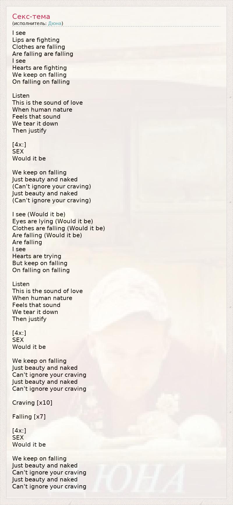 Я вижу, как Борются губы И падает одежда, Падает, падает. Я вижу, как Борются сердца. Мы продолжаем падать, Падать, падать... Послушай - Это звук любви. Когда человеческое естество Слышит этот звук, Мы раздеваемся, А потом оправдываем... [4 раза:] Секс, Если он случается... Мы продолжаем падать... Просто обнажённая красота... (Не могу игнорировать твоё страстное желание) Просто обнажённая красота... (Не могу игнорировать твоё страстное желание) Я вижу, как (если он случается) Глаза врут, (если он случается) И одежда падает, (если он случается) Падает, (если он случается) Падает... Я вижу, как Сердца стараются держаться, Но продолжают падать, Падать, падать... Послушай - Это звук любви. Когда человеческое естество Слышит этот звук, Мы раздеваемся, А потом оправдываем... [4 раза:] Секс, Если он случается... Мы продолжаем падать... Просто обнажённая красота... (Не могу игнорировать твоё страстное желание) Просто обнажённая красота... (Не могу игнорировать твоё страстное желание) Страстному желанию [10 раз] Падаем [7 раз] [4 раза:] Секс, Если он случается... Мы продолжаем падать... Просто обнажённая красота... (Не могу игнорировать твоё страстное желание) Просто обнажённая красота... (Не могу игнорировать твоё страстное желание)
