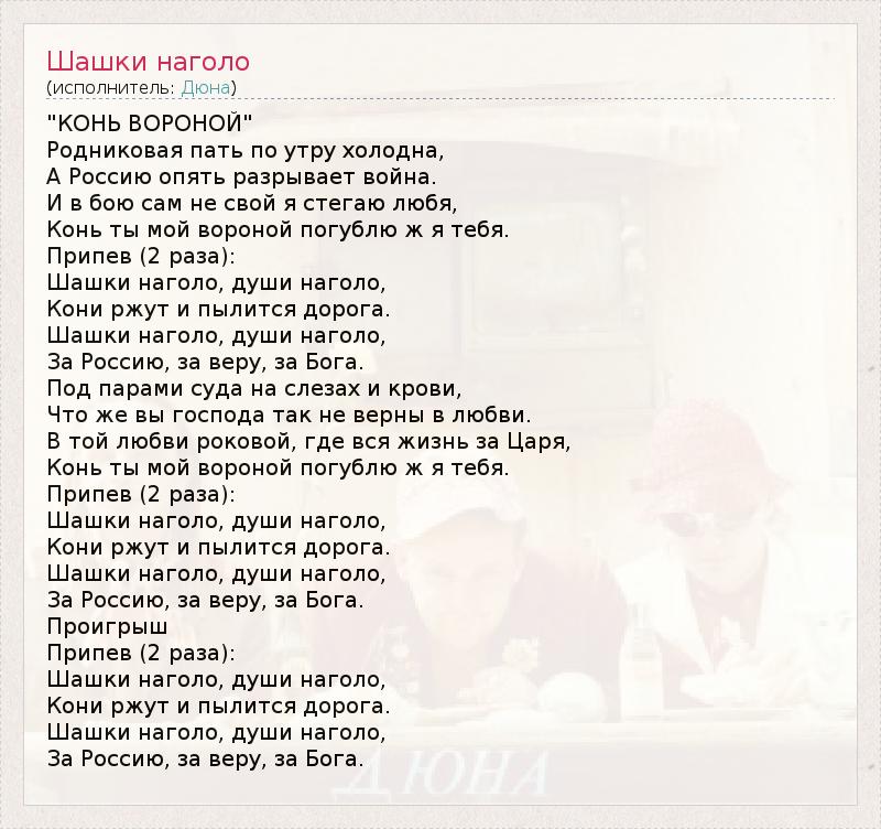 "КОНЬ ВОРОНОЙ" Родниковая пать по утру холодна, А Россию опять разрывает война. И в бою сам не свой я стегаю любя, Конь ты мой вороной погублю ж я тебя. Припев (2 раза): Шашки наголо, души наголо, Кони ржут и пылится дорога. Шашки наголо, души наголо, За Россию, за веру, за Бога. Под парами суда на слезах и крови, Что же вы господа так не верны в любви. В той любви роковой, где вся жизнь за Царя, Конь ты мой вороной погублю ж я тебя. Припев (2 раза): Шашки наголо, души наголо, Кони ржут и пылится дорога. Шашки наголо, души наголо, За Россию, за веру, за Бога. Проигрыш Припев (2 раза): Шашки наголо, души наголо, Кони ржут и пылится дорога. Шашки наголо, души наголо, За Россию, за веру, за Бога.