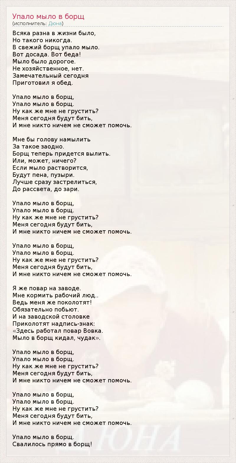 Всяка разна в жизни было, Но такого никогда. В свежий борщ упало мыло. Вот досада. Вот беда! Мыло было дорогое. Не хозяйственное, нет. Замечательный сегодня Приготовил я обед. Упало мыло в борщ, Упало мыло в борщ. Ну как же мне не грустить? Меня сегодня будут бить, И мне никто ничем не сможет помочь. Мне бы голову намылить За такое заодно. Борщ теперь придется вылить. Или, может, ничего? Если мыло растворится, Будут пена, пузыри. Лучше сразу застрелиться, До рассвета, до зари. Упало мыло в борщ, Упало мыло в борщ. Ну как же мне не грустить? Меня сегодня будут бить, И мне никто ничем не сможет помочь. Упало мыло в борщ, Упало мыло в борщ. Ну как же мне не грустить? Меня сегодня будут бить, И мне никто ничем не сможет помочь. Я же повар на заводе. Мне кормить рабочий люд.. Ведь меня же поколотят! Обязательно побьют. И на заводской столовке Приколотят надпись-знак: «Здесь работал повар Вовка. Мыло в борщ кидал, чудак». Упало мыло в борщ, Упало мыло в борщ. Ну как же мне не грустить? Меня сегодня будут бить, И мне никто ничем не сможет помочь. Упало мыло в борщ, Упало мыло в борщ. Ну как же мне не грустить? Меня сегодня будут бить, И мне никто ничем не сможет помочь. Упало мыло в борщ. Свалилось прямо в борщ!