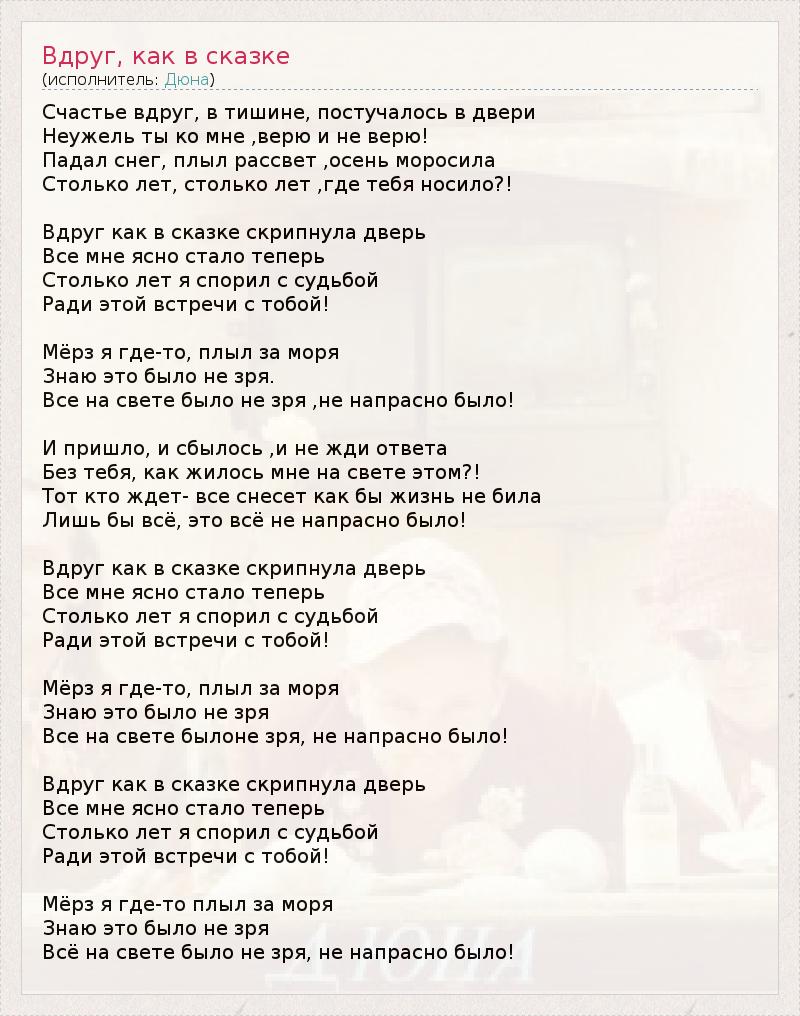 Счастье вдруг, в тишине, постучалось в двери Неужель ты ко мне ,верю и не верю! Падал снег, плыл рассвет ,осень моросила Столько лет, столько лет ,где тебя носило?! Вдруг как в сказке скрипнула дверь Все мне ясно стало теперь Столько лет я спорил с судьбой Ради этой встречи с тобой! Мёрз я где-то, плыл за моря Знаю это было не зря. Все на свете было не зря ,не напрасно было! И пришло, и сбылось ,и не жди ответа Без тебя, как жилось мне на свете этом?! Тот кто ждет- все снесет как бы жизнь не била Лишь бы всё, это всё не напрасно было! Вдруг как в сказке скрипнула дверь Все мне ясно стало теперь Столько лет я спорил с судьбой Ради этой встречи с тобой! Мёрз я где-то, плыл за моря Знаю это было не зря Все на свете былоне зря, не напрасно было! Вдруг как в сказке скрипнула дверь Все мне ясно стало теперь Столько лет я спорил с судьбой Ради этой встречи с тобой! Мёрз я где-то плыл за моря Знаю это было не зря Всё на свете было не зря, не напрасно было!