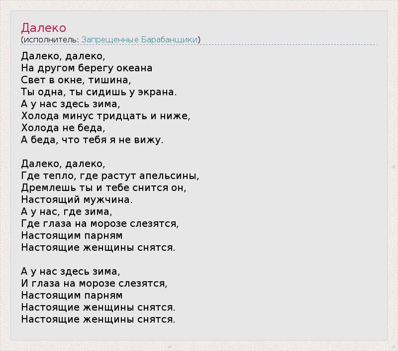 Далеко, далеко, На другом берегу океана Свет в окне, тишина, Ты одна, ты сидишь у экрана. А у нас здесь зима, Холода минус тридцать и ниже, Холода не беда, А беда, что тебя я не вижу. Далеко, далеко, Где тепло, где растут апельсины, Дремлешь ты и тебе снится он, Настоящий мужчина. А у нас, где зима, Где глаза на морозе слезятся, Настоящим парням Настоящие женщины снятся. А у нас здесь зима, И глаза на морозе слезятся, Настоящим парням Настоящие женщины снятся. Настоящие женщины снятся.