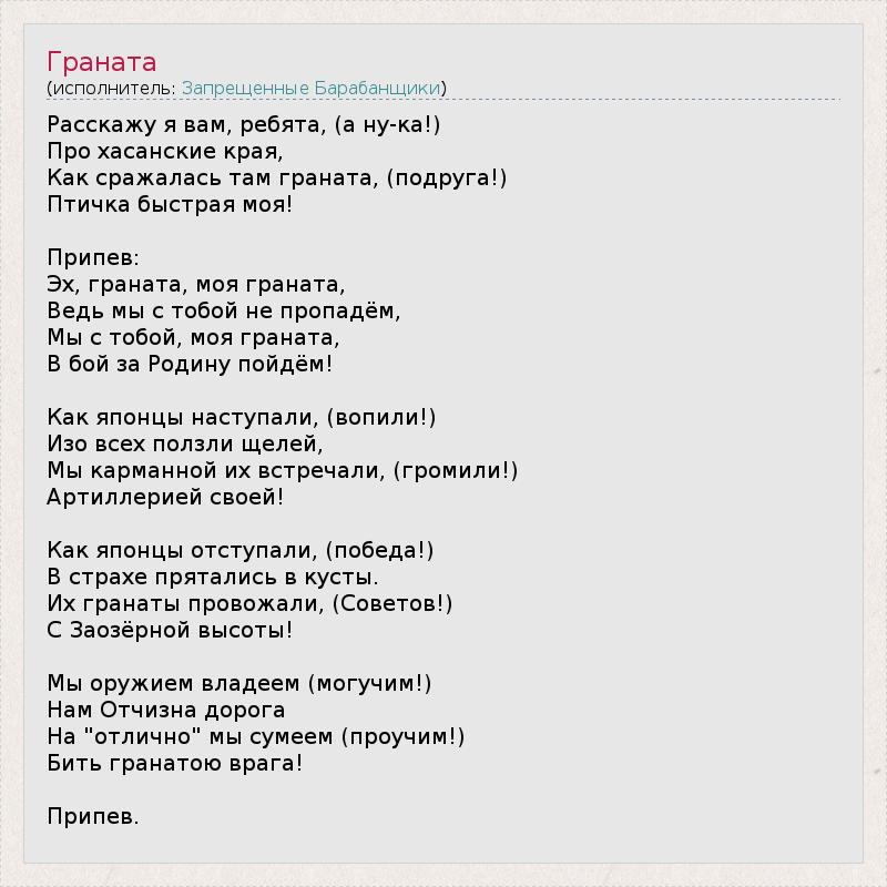 Расскажу я вам, ребята, (а ну-ка!) Про хасанские края, Как сражалась там граната, (подруга!) Птичка быстрая моя! Припев: Эх, граната, моя граната, Ведь мы с тобой не пропадём, Мы с тобой, моя граната, В бой за Родину пойдём! Как японцы наступали, (вопили!) Изо всех ползли щелей, Мы карманной их встречали, (громили!) Артиллерией своей! Как японцы отступали, (победа!) В страхе прятались в кусты. Их гранаты провожали, (Советов!) С Заозёрной высоты! Мы оружием владеем (могучим!) Нам Отчизна дорога На "отлично" мы сумеем (проучим!) Бить гранатою врага! Припев.