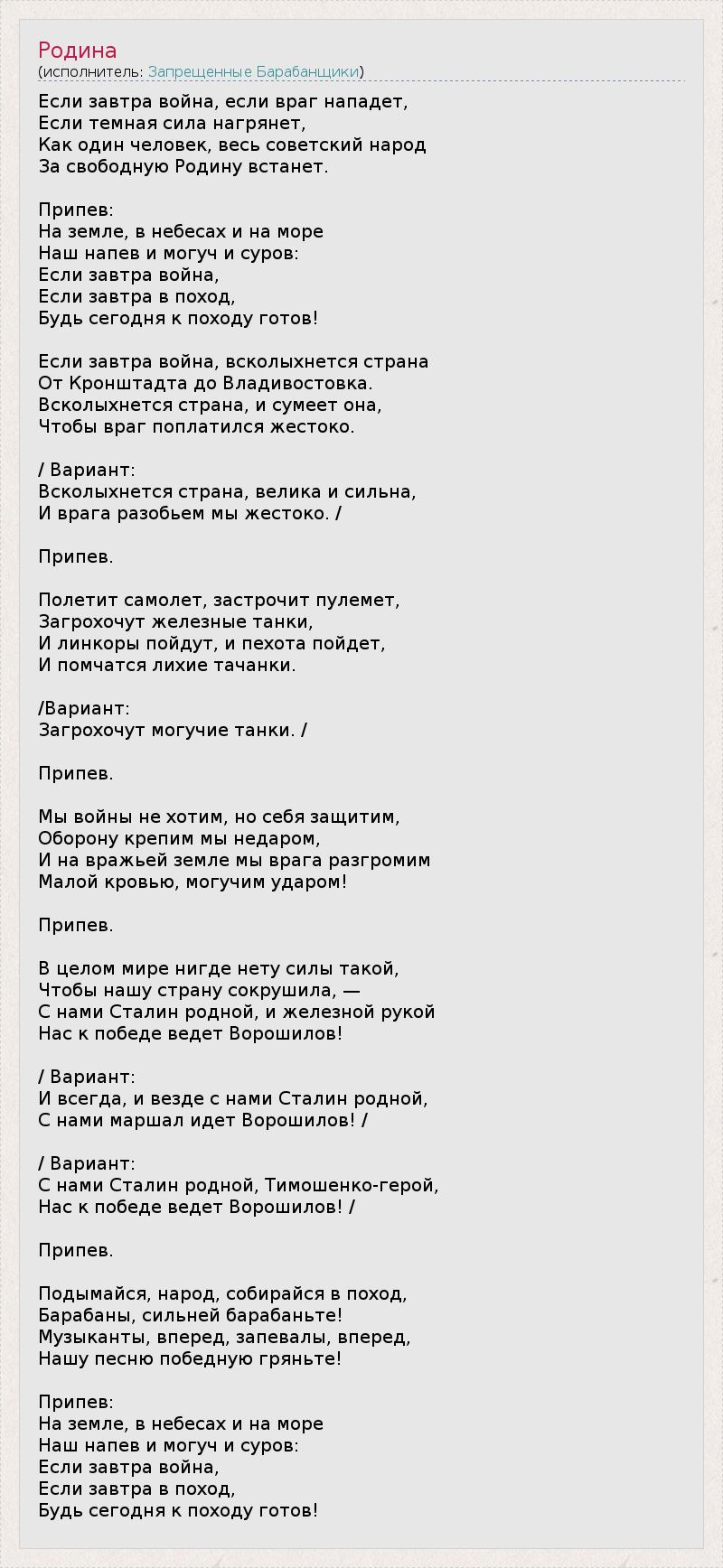 Если завтра война, если враг нападет, Если темная сила нагрянет, Как один человек, весь советский народ За свободную Родину встанет. Припев: На земле, в небесах и на море Наш напев и могуч и суров: Если завтра война, Если завтра в поход, Будь сегодня к походу готов! Если завтра война, всколыхнется страна От Кронштадта до Владивостовка. Всколыхнется страна, и сумеет она, Чтобы враг поплатился жестоко. / Вариант: Всколыхнется страна, велика и сильна, И врага разобьем мы жестоко. / Припев. Полетит самолет, застрочит пулемет, Загрохочут железные танки, И линкоры пойдут, и пехота пойдет, И помчатся лихие тачанки. /Вариант: Загрохочут могучие танки. / Припев. Мы войны не хотим, но себя защитим, Оборону крепим мы недаром, И на вражьей земле мы врага разгромим Малой кровью, могучим ударом! Припев. В целом мире нигде нету силы такой, Чтобы нашу страну сокрушила, — С нами Сталин родной, и железной рукой Нас к победе ведет Ворошилов! / Вариант: И всегда, и везде с нами Сталин родной, С нами маршал идет Ворошилов! / / Вариант: С нами Сталин родной, Тимошенко-герой, Нас к победе ведет Ворошилов! / Припев. Подымайся, народ, собирайся в поход, Барабаны, сильней барабаньте! Музыканты, вперед, запевалы, вперед, Нашу песню победную гряньте! Припев: На земле, в небесах и на море Наш напев и могуч и суров: Если завтра война, Если завтра в поход, Будь сегодня к походу готов!