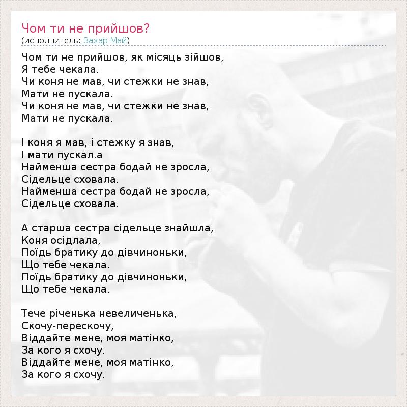 Chom ti not priyshov yak mіsyats zіyshov , I'll check. Chi horse not MAB chi stitches znav , Mother would not let me . Chi horse not MAB chi stitches znav , Mother would not let me . ² horse I mav , i stitch when ye knew me , I. Mother puskal.a Naymensha sister Boda not zrosla , Sіdeltse skhovala . Naymensha sister Boda not zrosla , Sіdeltse skhovala . And older sister sіdeltse znayshla , Osіdlala horse , Poїd little brother to dіvchinonki , Scho you check. Poїd little brother to dіvchinonki , Scho you check. Techa rіchenka nevelichenka , Scotch jump , Vіddayte Me , my matіnko , Who I skhochu . Vіddayte Me , my matіnko , Who I skhochu .