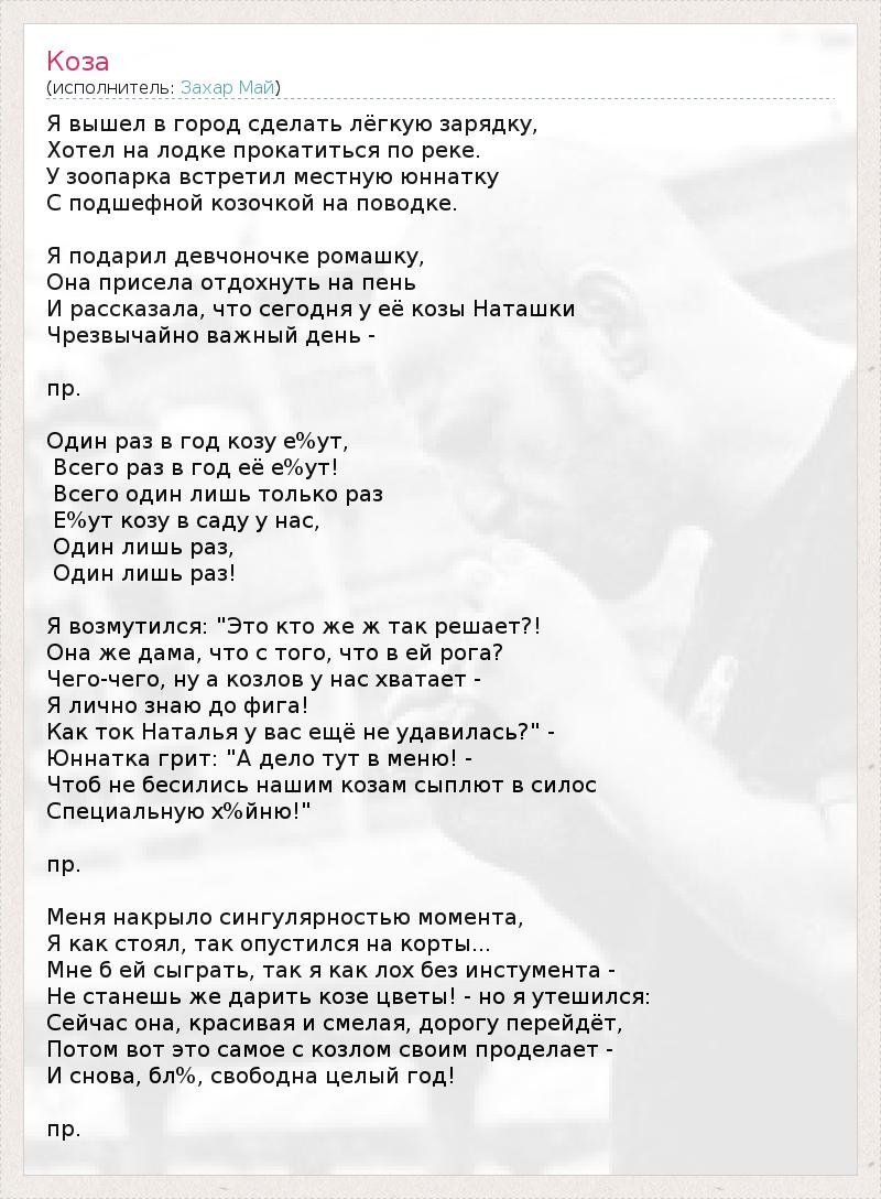 Я вышел в город сделать лёгкую зарядку, Хотел на лодке прокатиться по реке. У зоопарка встретил местную юннатку С подшефной козочкой на поводке. Я подарил девчоночке ромашку, Она присела отдохнуть на пень И рассказала, что сегодня у её козы Наташки Чрезвычайно важный день - пр. Один раз в год козу е%ут, Всего раз в год её е%ут! Всего один лишь только раз Е%ут козу в саду у нас, Один лишь раз, Один лишь раз! Я возмутился: "Это кто же ж так решает?! Она же дама, что с того, что в ей рога? Чего-чего, ну а козлов у нас хватает - Я лично знаю до фига! Как ток Наталья у вас ещё не удавилась?" - Юннатка грит: "А дело тут в меню! - Чтоб не бесились нашим козам сыплют в силос Специальную х%йню!" пр. Меня накрыло сингулярностью момента, Я как стоял, так опустился на корты... Мне б ей сыграть, так я как лох без инстумента - Не станешь же дарить козе цветы! - но я утешился: Сейчас она, красивая и смелая, дорогу перейдёт, Потом вот это самое с козлом своим проделает - И снова, бл%, свободна целый год! пр.