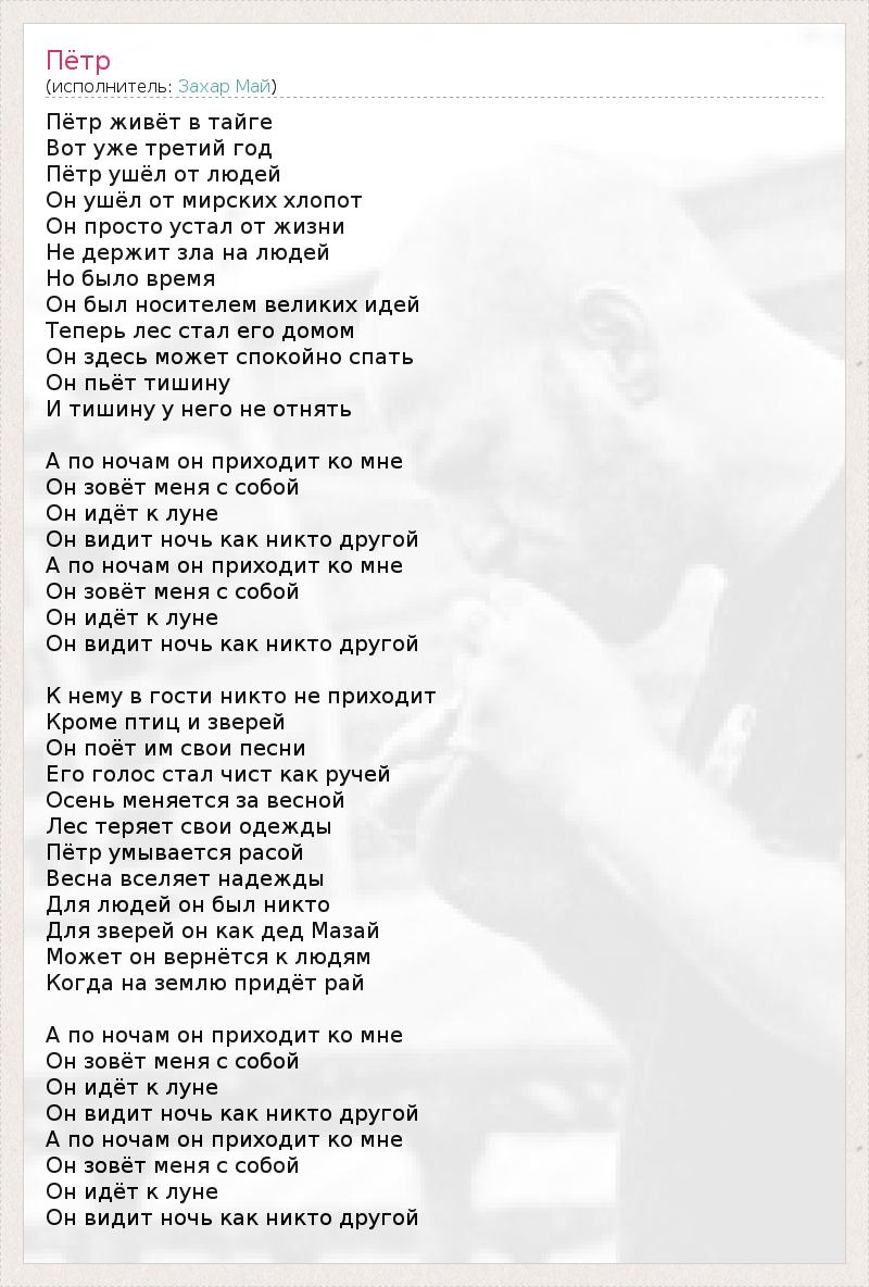 Пётр живёт в тайге Вот уже третий год Пётр ушёл от людей Он ушёл от мирских хлопот Он просто устал от жизни Не держит зла на людей Но было время Он был носителем великих идей Теперь лес стал его домом Он здесь может спокойно спать Он пьёт тишину И тишину у него не отнять А по ночам он приходит ко мне Он зовёт меня с собой Он идёт к луне Он видит ночь как никто другой А по ночам он приходит ко мне Он зовёт меня с собой Он идёт к луне Он видит ночь как никто другой К нему в гости никто не приходит Кроме птиц и зверей Он поёт им свои песни Его голос стал чист как ручей Осень меняется за весной Лес теряет свои одежды Пётр умывается расой Весна вселяет надежды Для людей он был никто Для зверей он как дед Мазай Может он вернётся к людям Когда на землю придёт рай А по ночам он приходит ко мне Он зовёт меня с собой Он идёт к луне Он видит ночь как никто другой А по ночам он приходит ко мне Он зовёт меня с собой Он идёт к луне Он видит ночь как никто другой
