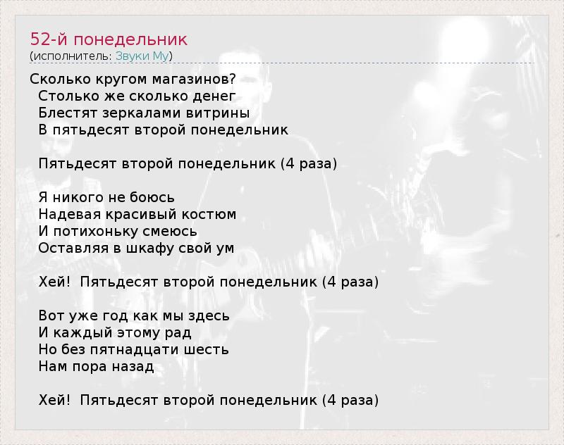 Сколько кругом магазинов? Столько же сколько денег Блестят зеркалами витрины В пятьдесят второй понедельник Пятьдесят второй понедельник (4 раза) Я никого не боюсь Надевая красивый костюм И потихоньку смеюсь Оставляя в шкафу свой ум Хей! Пятьдесят второй понедельник (4 раза) Вот уже год как мы здесь И каждый этому рад Но без пятнадцати шесть Нам пора назад Хей! Пятьдесят второй понедельник (4 раза)
