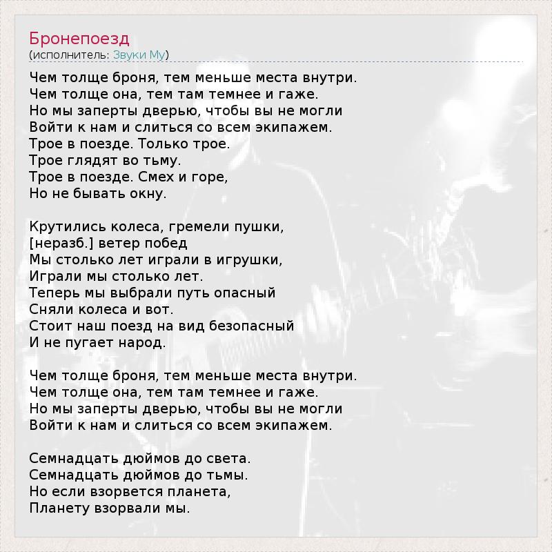 Чем толще броня, тем меньше места внутри. Чем толще она, тем там темнее и гаже. Но мы заперты дверью, чтобы вы не могли Войти к нам и слиться со всем экипажем. Трое в поезде. Только трое. Трое глядят во тьму. Трое в поезде. Смех и горе, Но не бывать окну. Крутились колеса, гремели пушки, [неразб.] ветер побед Мы столько лет играли в игрушки, Играли мы столько лет. Теперь мы выбрали путь опасный Сняли колеса и вот. Стоит наш поезд на вид безопасный И не пугает народ. Чем толще броня, тем меньше места внутри. Чем толще она, тем там темнее и гаже. Но мы заперты дверью, чтобы вы не могли Войти к нам и слиться со всем экипажем. Семнадцать дюймов до света. Семнадцать дюймов до тьмы. Но если взорвется планета, Планету взорвали мы.