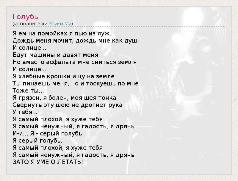 Я ем на помойках я пью из луж. Дождь меня мочит, дождь мне как душ. И солнце... Едут машины и давят меня. Но вместо асфальта мне сниться земля И солнце... Я хлебные крошки ищу на земле Ты пинаешь меня, но и тоскуешь по мне Тоже ты... Я грязен, я болен, моя шея тонка Свернуть эту шею не дрогнет рука У тебя... Я самый плохой, я хуже тебя Я самый ненужный, я гадость, я дрянь И-и... Я - серый голубь. Я серый голубь. Я самый плохой, я хуже тебя Я самый ненужный, я гадость, я дрянь ЗАТО Я УМЕЮ ЛЕТАТЬ!