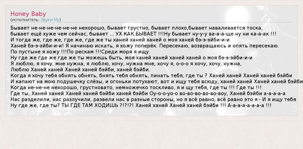 Бывает не-не-не-не-не-не нехорошо, бывает грустно, бывает плохо,бывает наваливается тоска, бывает ещё хуже чем сейчас, бывает ... УХ КАК БЫВАЕТ !!!Ну бывает ну-у-у ва-а-а-ще ну ни ка-а-ак !!! И тогда же, где же, где же, где же ты ханей ханей ханей о моя ханей бэ-э-эйби-и-и Ханей бэ-э-эйби-и-и! Я начинаю искать, я хожу поперёк. Пересекаю, возвращаюсь и опять пересекаю. По пустыне я хожу !!!По рескам !!!Среди моря я ищу. Ну где же где же где же ты можешь быть, моя ханей ханей ханей ханей о моя бэ-э-эйби-и-и Я люблю, я хочу, мне нужна, я люблю, хочу, нужна мне, хочу я, о-о-о я хочу, хочу, нужна, Люблю Ханей ханей Ханей ханей бэйби, ханей бэйби. Когда я хочу тебя обнять обнять, бнять тебя обнять, пинать тебя, где ты ? Ханей ханей Ханей ханей бэйби И капают на мою подушечку слёзы, и огоньки потухают, вот и ищу тебя всюду, ханей ханей Ханей ханей бэйби Когда не-не-не нехорошо, грустновато, немножечко тоскливо, я и щу тебя, где ты !!! Где ты !!! Где ты, Ханей ханей Ханей ханей бэйби ханей бэйби Оу-о-о-уо-о во-во-во-во-во-воу, Ханей бэйби а-а-а-а-а Нас разделили, нас разлучили, развели нас в разные стороны, но я всё равно, всё равно это я - И я ищу тебя Ну где же, где ты? ТЫ ГДЕ ТАМ ХОДИШЬ ?!?!?! Ханей ханей Ханей ханей бэйби !!! А-а-а-а-а-а-а-а !!!