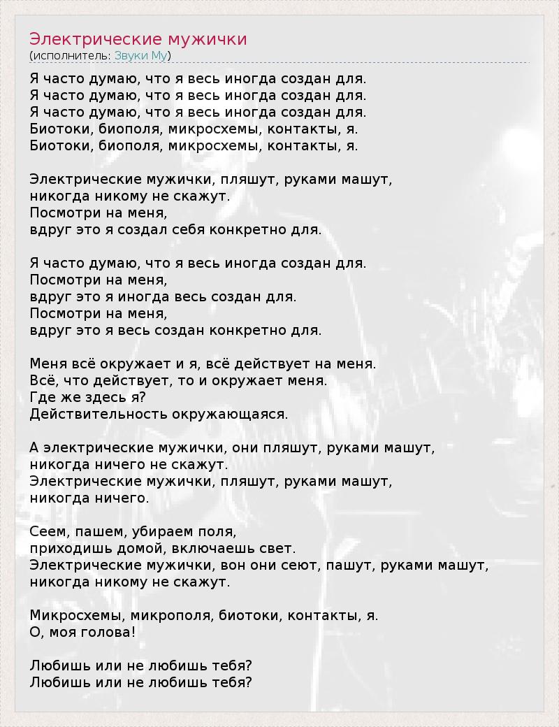 Я часто думаю, что я весь иногда создан для. Я часто думаю, что я весь иногда создан для. Я часто думаю, что я весь иногда создан для. Биотоки, биополя, микросхемы, контакты, я. Биотоки, биополя, микросхемы, контакты, я. Электрические мужички, пляшут, руками машут, никогда никому не скажут. Посмотри на меня, вдруг это я создал себя конкретно для. Я часто думаю, что я весь иногда создан для. Посмотри на меня, вдруг это я иногда весь создан для. Посмотри на меня, вдруг это я весь создан конкретно для. Меня всё окружает и я, всё действует на меня. Всё, что действует, то и окружает меня. Где же здесь я? Действительность окружающаяся. А электрические мужички, они пляшут, руками машут, никогда ничего не скажут. Электрические мужички, пляшут, руками машут, никогда ничего. Сеем, пашем, убираем поля, приходишь домой, включаешь свет. Электрические мужички, вон они сеют, пашут, руками машут, никогда никому не скажут. Микросхемы, микрополя, биотоки, контакты, я. О, моя голова! Любишь или не любишь тебя? Любишь или не любишь тебя?