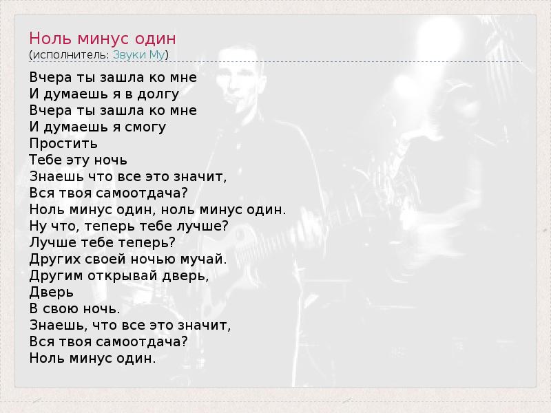 Вчера ты зашла ко мне И думаешь я в долгу Вчера ты зашла ко мне И думаешь я смогу Простить Тебе эту ночь Знаешь что все это значит, Вся твоя самоотдача? Ноль минус один, ноль минус один. Ну что, теперь тебе лучше? Лучше тебе теперь? Других своей ночью мучай. Другим открывай дверь, Дверь В свою ночь. Знаешь, что все это значит, Вся твоя самоотдача? Ноль минус один.