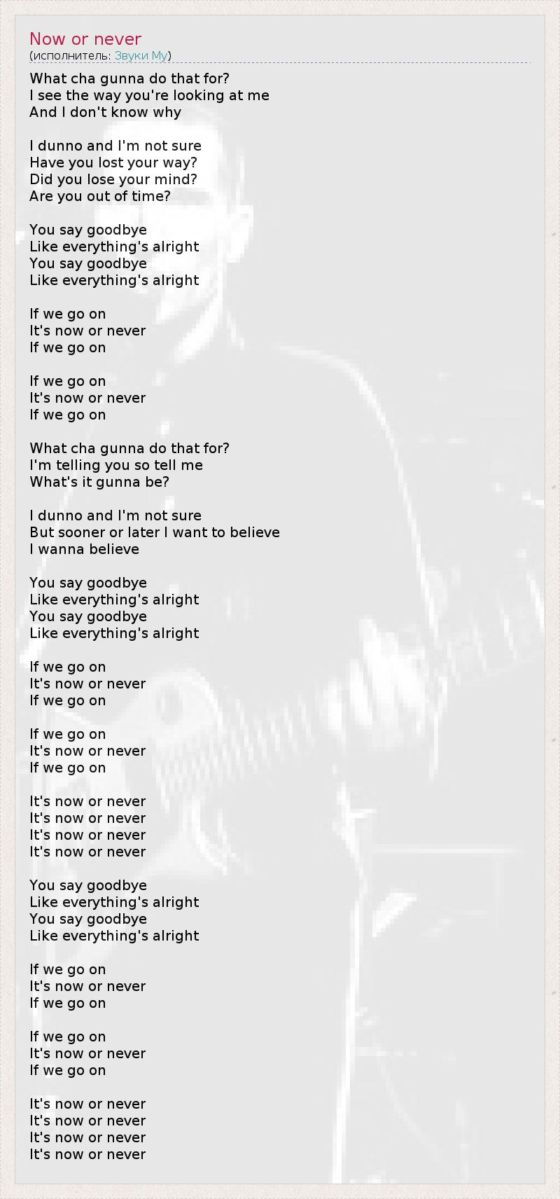 What cha gunna do that for? I see the way you're looking at me And I don't know why I dunno and I'm not sure Have you lost your way? Did you lose your mind? Are you out of time? You say goodbye Like everything's alright You say goodbye Like everything's alright If we go on It's now or never If we go on If we go on It's now or never If we go on What cha gunna do that for? I'm telling you so tell me What's it gunna be? I dunno and I'm not sure But sooner or later I want to believe I wanna believe You say goodbye Like everything's alright You say goodbye Like everything's alright If we go on It's now or never If we go on If we go on It's now or never If we go on It's now or never It's now or never It's now or never It's now or never You say goodbye Like everything's alright You say goodbye Like everything's alright If we go on It's now or never If we go on If we go on It's now or never If we go on It's now or never It's now or never It's now or never It's now or never