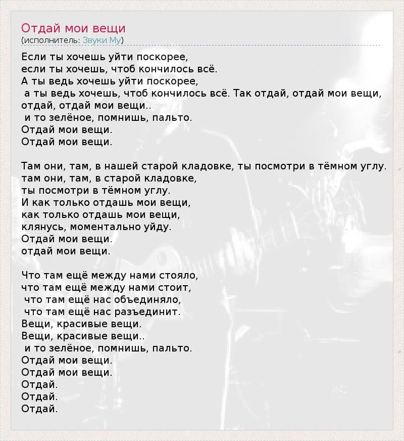 Если ты хочешь уйти поскорее, если ты хочешь, чтоб кончилось всё. А ты ведь хочешь уйти поскорее, а ты ведь хочешь, чтоб кончилось всё. Так отдай, отдай мои вещи, отдай, отдай мои вещи.. и то зелёное, помнишь, пальто. Отдай мои вещи. Отдай мои вещи. Там они, там, в нашей старой кладовке, ты посмотри в тёмном углу. там они, там, в старой кладовке, ты посмотри в тёмном углу. И как только отдашь мои вещи, как только отдашь мои вещи, клянусь, моментально уйду. Отдай мои вещи. отдай мои вещи. Что там ещё между нами стояло, что там ещё между нами стоит, что там ещё нас объединяло, что там ещё нас разъединит. Вещи, красивые вещи. Вещи, красивые вещи.. и то зелёное, помнишь, пальто. Отдай мои вещи. Отдай мои вещи. Отдай. Отдай. Отдай.