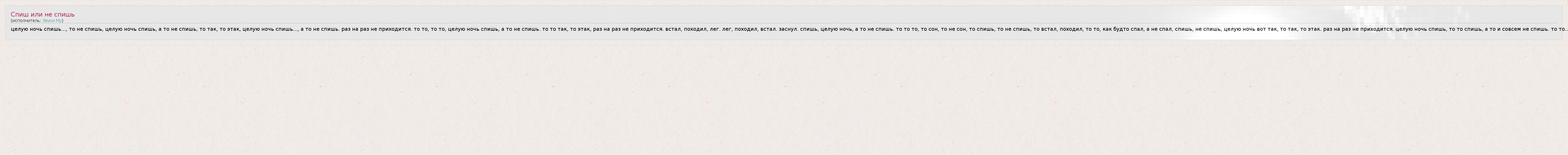 целую ночь спишь..., то не спишь, целую ночь спишь, а то не спишь, то так, то этак, целую ночь спишь..., а то не спишь. раз на раз не приходится. то то, то то, целую ночь спишь, а то не спишь. то то так, то этак, раз на раз не приходится. встал, походил, лег. лег, походил, встал. заснул. спишь, целую ночь, а то не спишь. то то то, то сон, то не сон, то спишь, то не спишь, то встал, походил, то то, как будто спал, а не спал, спишь, не спишь, целую ночь вот так, то так, то этак. раз на раз не приходится. целую ночь спишь, то то спишь, а то и совсем не спишь. то то..