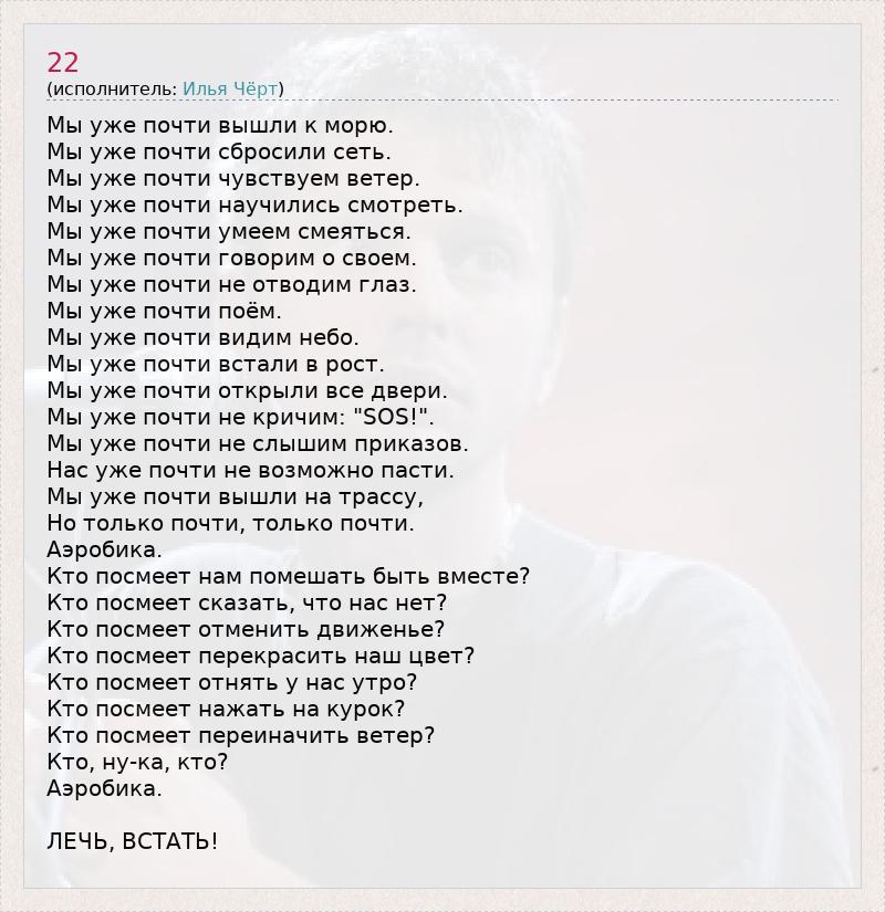 Мы уже почти вышли к морю. Мы уже почти сбросили сеть. Мы уже почти чувствуем ветер. Мы уже почти научились смотреть. Мы уже почти умеем смеяться. Мы уже почти говорим о своем. Мы уже почти не отводим глаз. Мы уже почти поём. Мы уже почти видим небо. Мы уже почти встали в рост. Мы уже почти открыли все двери. Мы уже почти не кричим: "SOS!". Мы уже почти не слышим приказов. Нас уже почти не возможно пасти. Мы уже почти вышли на трассу, Но только почти, только почти. Аэробика. Кто посмеет нам помешать быть вместе? Кто посмеет сказать, что нас нет? Кто посмеет отменить движенье? Кто посмеет перекрасить наш цвет? Кто посмеет отнять у нас утро? Кто посмеет нажать на курок? Кто посмеет переиначить ветер? Кто, ну-ка, кто? Аэробика. ЛЕЧЬ, ВСТАТЬ!