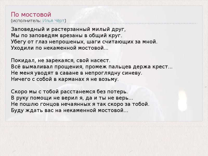 Заповедный и растерзанный милый друг, Мы по заповедям врезаны в общий круг. Убегу от глаз непрошеных, шаги считающих за мной. Уходили по некаменной мостовой... Покидал, не зарекаяся, свой насест. Всё вымаливал прощения, промеж пальцев держа крест... Не меня уводят в саване в непроглядну синеву. Ничего с собой в карманах я не возьму. Скоро мы с тобой расстанемся без потерь. В руку помощи не верил я, да и ты не верь... Не пошлю гонцов нечаянных я так скоро за тобой. Буду ждать вас на некаменной мостовой...