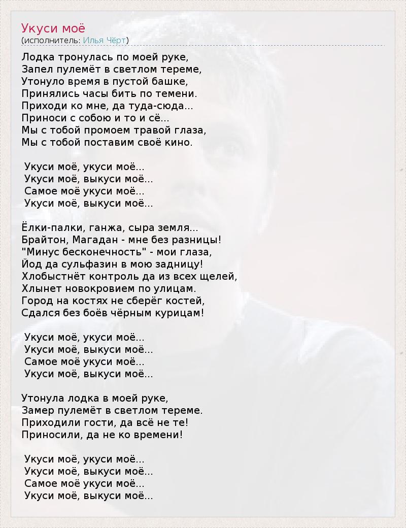 Лодка тронулась по моей руке, Запел пулемёт в светлом тереме, Утонуло время в пустой башке, Принялись часы бить по темени. Приходи ко мне, да туда-сюда... Приноси с собою и то и сё... Мы с тобой промоем травой глаза, Мы с тобой поставим своё кино. Укуси моё, укуси моё... Укуси моё, выкуси моё... Самое моё укуси моё... Укуси моё, выкуси моё... Ёлки-палки, ганжа, сыра земля... Брайтон, Магадан - мне без разницы! "Минус бесконечность" - мои глаза, Йод да сульфазин в мою задницу! Хлобыстнёт контроль да из всех щелей, Хлынет новокровием по улицам. Город на костях не сберёг костей, Сдался без боёв чёрным курицам! Укуси моё, укуси моё... Укуси моё, выкуси моё... Самое моё укуси моё... Укуси моё, выкуси моё... Утонула лодка в моей руке, Замер пулемёт в светлом тереме. Приходили гости, да всё не те! Приносили, да не ко времени! Укуси моё, укуси моё... Укуси моё, выкуси моё... Самое моё укуси моё... Укуси моё, выкуси моё...