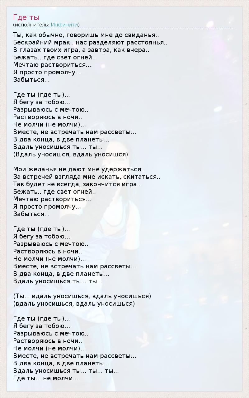 Это интересно:Группа «Инфинити» номинант премии "Золотой Граммофон" в 2008, 2010 годах.Лауреат "Песни Года 2010".Солистка группы «Инфинити» Татьяна Бондаренко.Группа «Инфинити» берёт своё начало в далёком 1999 году. До 2006 года группа называлась «Чёрное и Белое». Первые треки записывались ещё тогда, но до выступлений и концертов было ещё очень далеко. Упорство и огромный творческий потенциал... продолжение