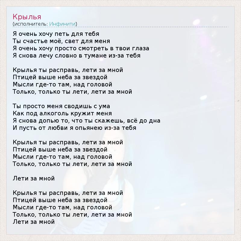 Я очень хочу петь для тебя Ты счастье моё, свет для меня Я очень хочу просто смотреть в твои глаза Я снова лечу словно в тумане из-за тебя Крылья ты расправь, лети за мной Птицей выше неба за звездой Мысли где-то там, над головой Только, только ты лети, лети за мной Ты просто меня сводишь с ума Как под алкоголь кружит меня Я снова допью то, что ты скажешь, всё до дна И пусть от любви я опьянею из-за тебя Крылья ты расправь, лети за мной Птицей выше неба за звездой Мысли где-то там, над головой Только, только ты лети, лети за мной Лети за мной Крылья ты расправь, лети за мной Птицей выше неба за звездой Мысли где-то там, над головой Только, только ты лети, лети за мной Лети за мной