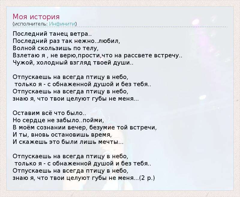 Последний танец ветра.. Последний раз так нежно..любил, Волной скользишь по телу, Взлетаю я , не верю,прости,что на рассвете встречу.. Чужой, холодный взгляд твоей души.. Отпускаешь на всегда птицу в небо, только я - с обнаженной душой и без тебя.. Отпускаешь на всегда птицу в небо, знаю я, что твои целуют губы не меня... Оставим всё что было.. Но сердце не забыло..пойми, В моём сознании вечер, безумие той встречи, И ты, вновь остановишь время, И скажешь это были лишь мечты... Отпускаешь на всегда птицу в небо, только я - с обнаженной душой и без тебя.. Отпускаешь на всегда птицу в небо, знаю я, что твои целуют губы не меня...(2 р.)