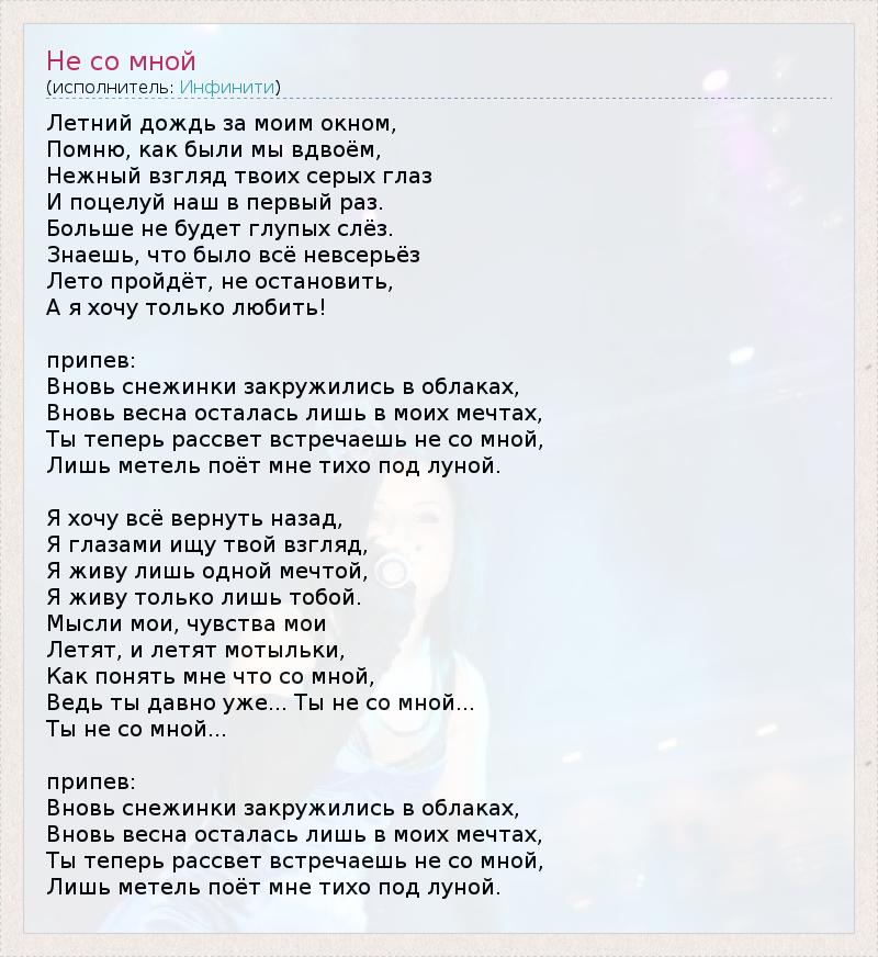 Летний дождь за моим окном, Помню, как были мы вдвоём, Нежный взгляд твоих серых глаз И поцелуй наш в первый раз. Больше не будет глупых слёз. Знаешь, что было всё невсерьёз Лето пройдёт, не остановить, А я хочу только любить! припев: Вновь снежинки закружились в облаках, Вновь весна осталась лишь в моих мечтах, Ты теперь рассвет встречаешь не со мной, Лишь метель поёт мне тихо под луной. Я хочу всё вернуть назад, Я глазами ищу твой взгляд, Я живу лишь одной мечтой, Я живу только лишь тобой. Мысли мои, чувства мои Летят, и летят мотыльки, Как понять мне что со мной, Ведь ты давно уже... Ты не со мной... Ты не со мной... припев: Вновь снежинки закружились в облаках, Вновь весна осталась лишь в моих мечтах, Ты теперь рассвет встречаешь не со мной, Лишь метель поёт мне тихо под луной.