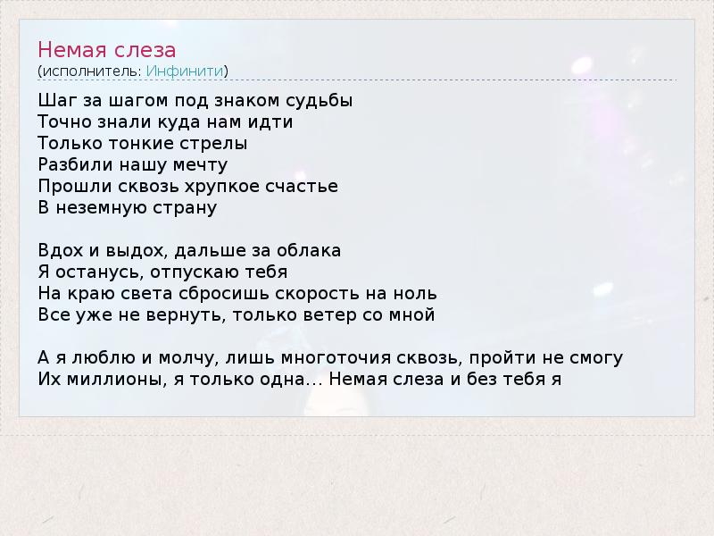 Шаг за шагом под знаком судьбы Точно знали куда нам идти Только тонкие стрелы Разбили нашу мечту Прошли сквозь хрупкое счастье В неземную страну Вдох и выдох, дальше за облака Я останусь, отпускаю тебя На краю света сбросишь скорость на ноль Все уже не вернуть, только ветер со мной А я люблю и молчу, лишь многоточия сквозь, пройти не смогу Их миллионы, я только одна… Немая слеза и без тебя я
