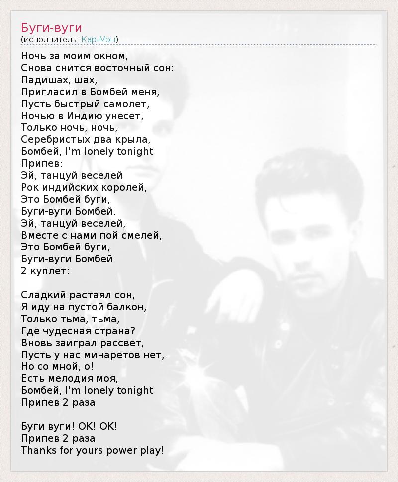 Ночь за моим окном, Снова снится восточный сон: Падишах, шах, Пригласил в Бомбей меня, Пусть быстрый самолет, Ночью в Индию унесет, Только ночь, ночь, Серебристых два крыла, Бомбей, I'm lonely tonight Припев: Эй, танцуй веселей Рок индийских королей, Это Бомбей буги, Буги-вуги Бомбей. Эй, танцуй веселей, Вместе с нами пой смелей, Это Бомбей буги, Буги-вуги Бомбей 2 куплет: Сладкий растаял сон, Я иду на пустой балкон, Только тьма, тьма, Где чудесная страна? Вновь заиграл рассвет, Пусть у нас минаретов нет, Но со мной, о! Есть мелодия моя, Бомбей, I'm lonely tonight Припев 2 раза Буги вуги! OK! OK! Припев 2 раза Thanks for yours power play!