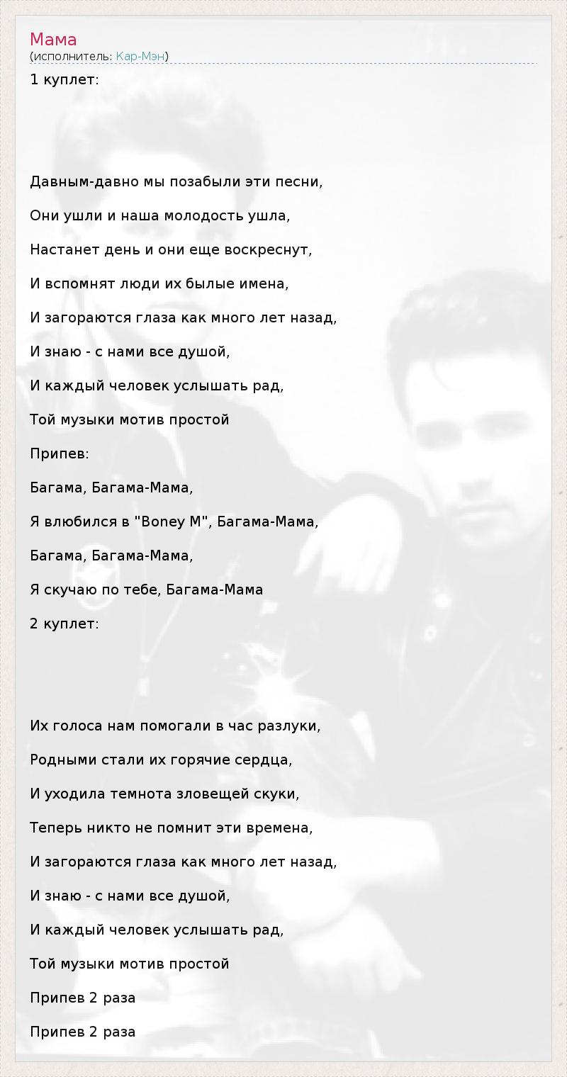 1 куплет: Давным-давно мы позабыли эти песни, Они ушли и наша молодость ушла, Настанет день и они еще воскреснут, И вспомнят люди их былые имена, И загораются глаза как много лет назад, И знаю - с нами все душой, И каждый человек услышать рад, Той музыки мотив простой Припев: Багама, Багама-Мама, Я влюбился в "Boney M", Багама-Мама, Багама, Багама-Мама, Я скучаю по тебе, Багама-Мама 2 куплет: Их голоса нам помогали в час разлуки, Родными стали их горячие сердца, И уходила темнота зловещей скуки, Теперь никто не помнит эти времена, И загораются глаза как много лет назад, И знаю - с нами все душой, И каждый человек услышать рад, Той музыки мотив простой Припев 2 раза Припев 2 раза
