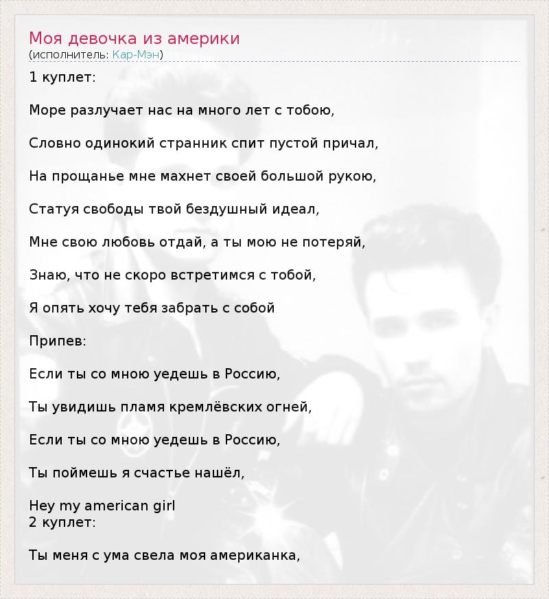 1 куплет: Море разлучает нас на много лет с тобою, Словно одинокий странник спит пустой причал, На прощанье мне махнет своей большой рукою, Статуя свободы твой бездушный идеал, Мне свою любовь отдай, а ты мою не потеряй, Знаю, что не скоро встретимся с тобой, Я опять хочу тебя забрать с собой Припев: Если ты со мною уедешь в Россию, Ты увидишь пламя кремлёвских огней, Если ты со мною уедешь в Россию, Ты поймешь я счастье нашёл, Hey my american girl 2 куплет: Ты меня с ума свела моя американка,