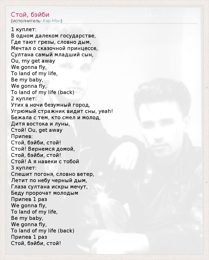 1 куплет: В одном далеком государстве, Где тают грезы, словно дым, Мечтал о сказочной принцессе, Султана самый младший сын, Ou, my get away We gonna fly, To land of my life, Be my baby, We gonna fly, To land of my life (back) 2 куплет: Утих в ночи безумный город, Угрюмый стражник видит сны, yeah! Бежала с тем, кто смел и молод, Дитя востока и луны, Стой! Ou, get away Припев: Стой, бэйби, стой! Стой! Вернемся домой, Стой, бэйби, стой! Стой! А я навеки с тобой 3 куплет: Спешит погоня, словно ветер, Летит по небу черный дым, Глаза султана искры мечут, Беду пророчат молодым Припев 1 раз We gonna fly, To land of my life, Be my baby, We gonna fly, To land of my life (back) Припев 1 раз Стой, бэйби, стой!