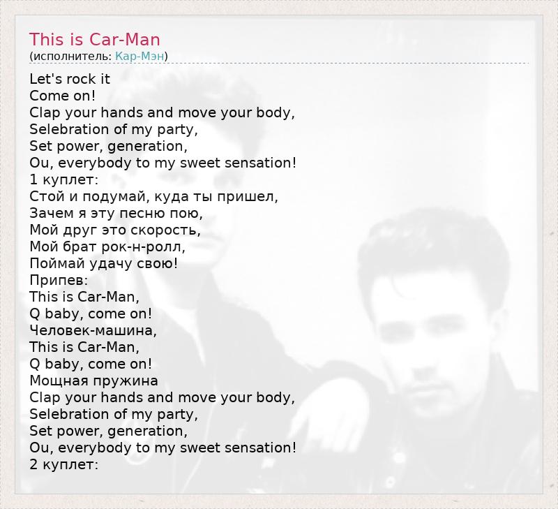 Let's rock it Come on! Clap your hands and move your body, Selebration of my party, Set power, generation, Ou, everybody to my sweet sensation! 1 куплет: Стой и подумай, куда ты пришел, Зачем я эту песню пою, Мой друг это скорость, Мой брат рок-н-ролл, Поймай удачу свою! Припев: This is Car-Man, Q baby, come on! Человек-машина, This is Car-Man, Q baby, come on! Мощная пружина Clap your hands and move your body, Selebration of my party, Set power, generation, Ou, everybody to my sweet sensation! 2 куплет: