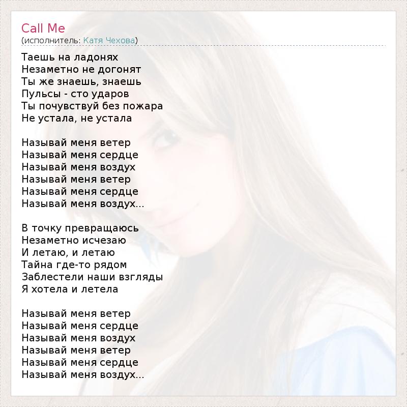 Таешь на ладонях Незаметно не догонят Ты же знаешь, знаешь Пульсы - сто ударов Ты почувствуй без пожара Не устала, не устала Называй меня ветер Называй меня сердце Называй меня воздух Называй меня ветер Называй меня сердце Называй меня воздух... В точку превращаюсь Незаметно исчезаю И летаю, и летаю Тайна где-то рядом Заблестели наши взгляды Я хотела и летела Называй меня ветер Называй меня сердце Называй меня воздух Называй меня ветер Называй меня сердце Называй меня воздух...